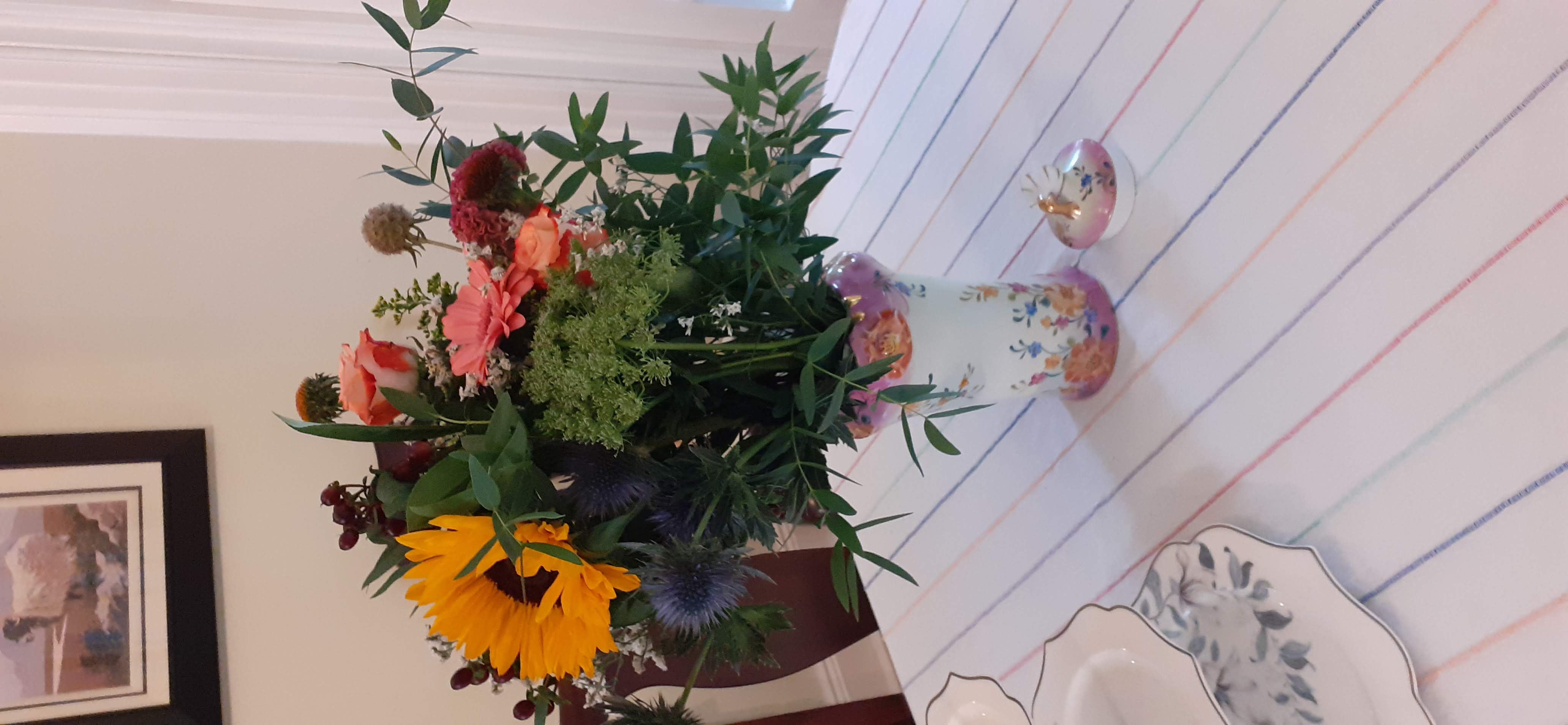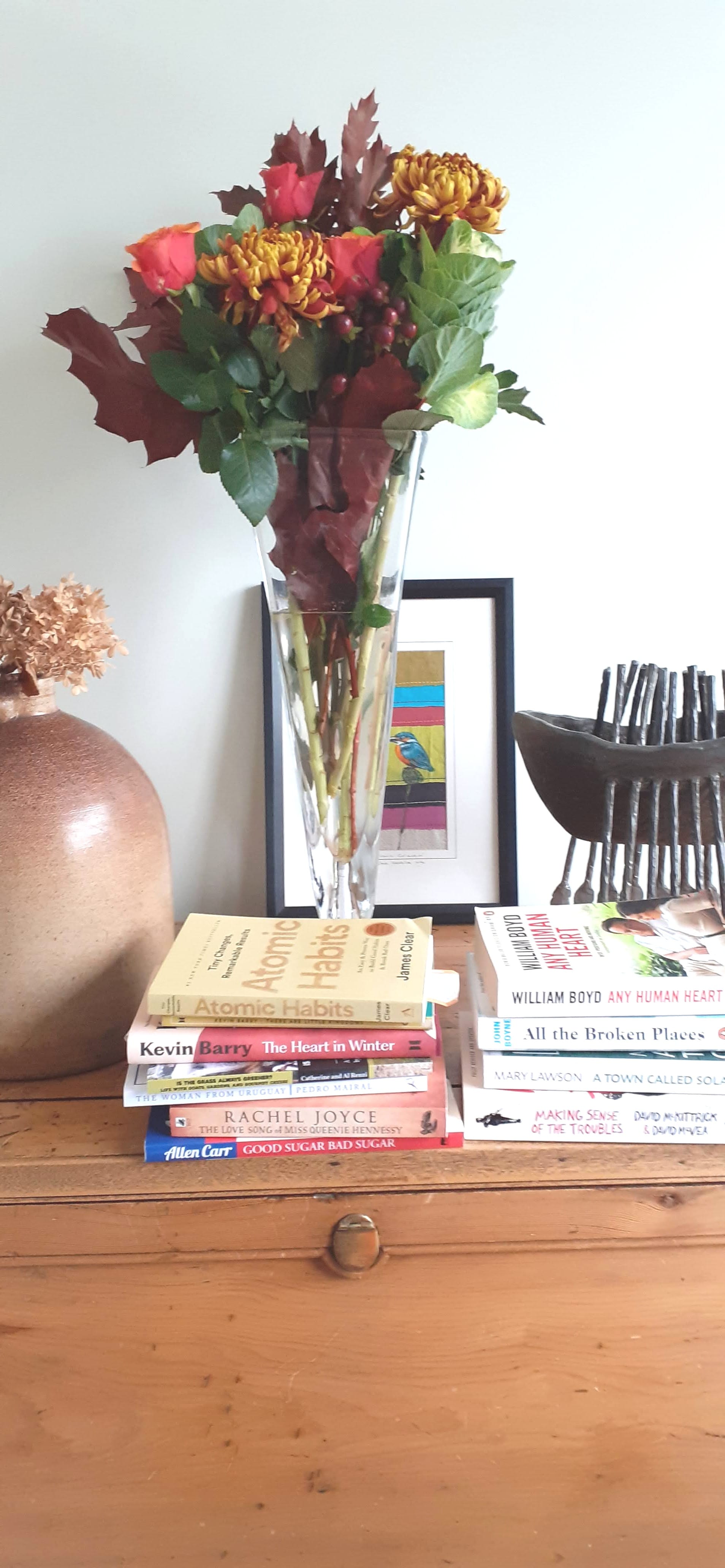 I worked last week, at a reduced pace – one-hand typing. And will work next week. In the meantime i have lots of books and lovely bouquets.