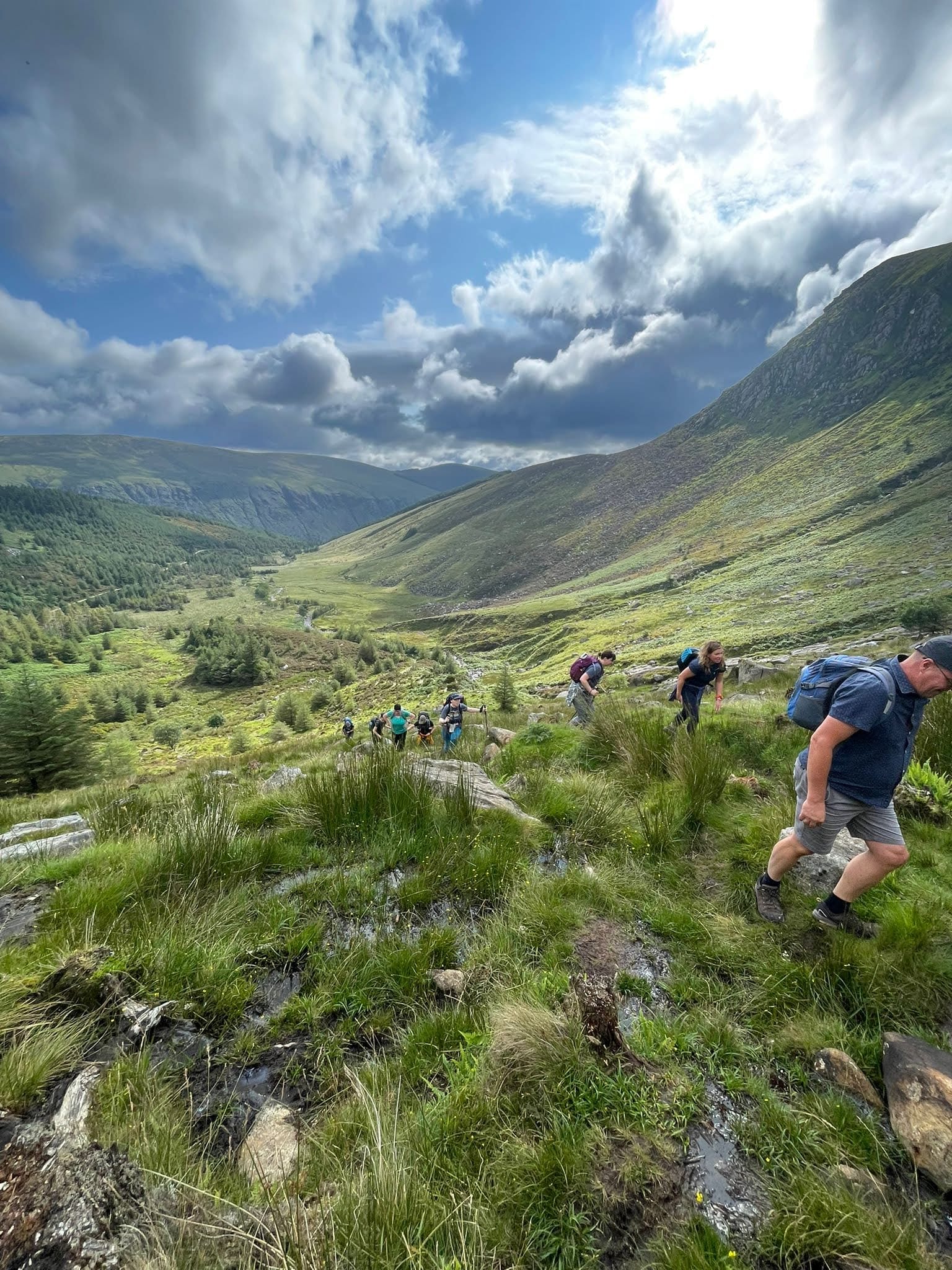We spent Friday and Saturday nights in a youth hostel near the Glendalough medieval monastic settlement. Day two was the Spinc trail, which goes up a ridge and down a valley, ending at one of the lakes of Glendalough. The first photo below taken by me, the second by Cathy, who is a much better photographer (and has a better phone/software).