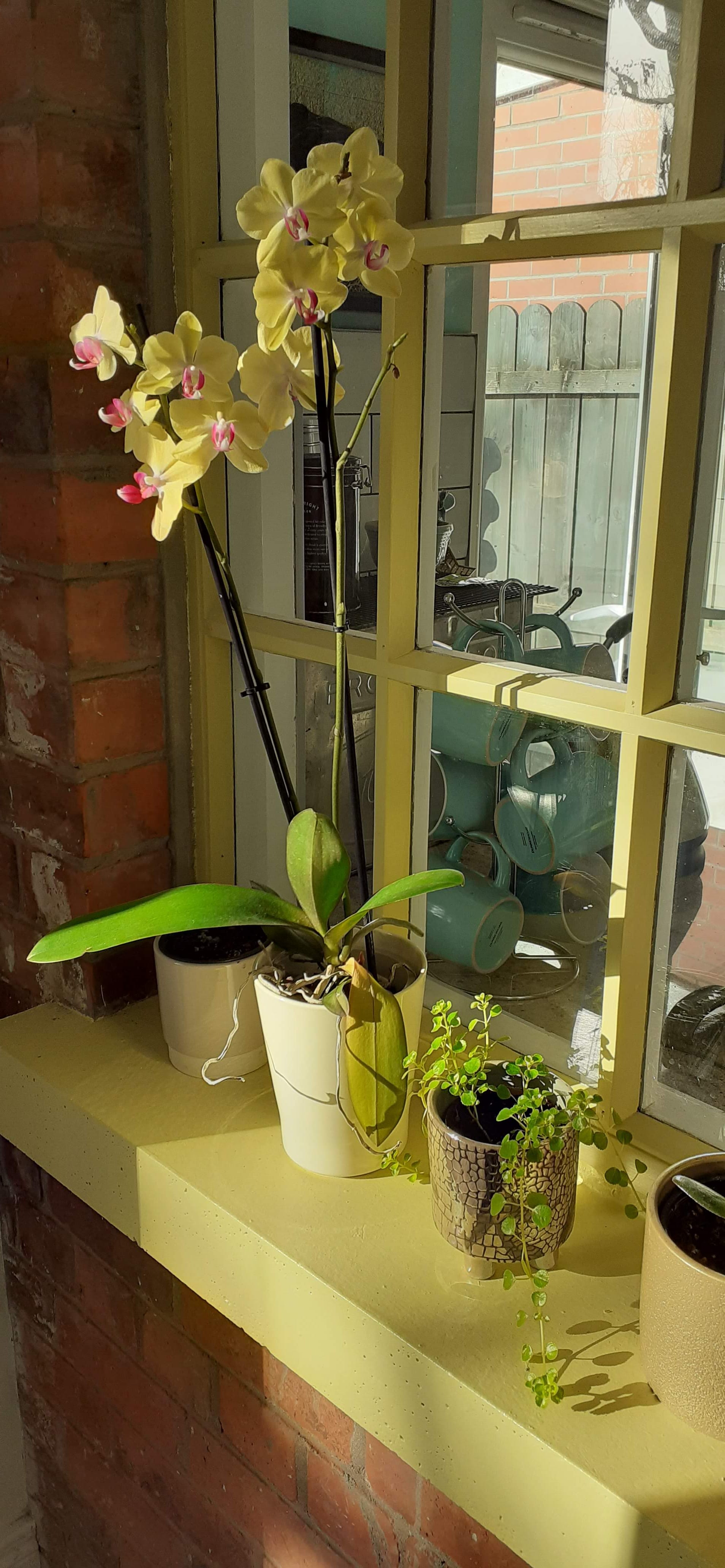 Yesterday I visited a photo exhibit and an art exhibit in Belfast. The art exhibit included a series of lush botanical paintings – done last year but modelled on 17th century Dutch paintings. Closer to home, I took a photo of this orchid in my sunroom, amazed that it has been going strong since October.