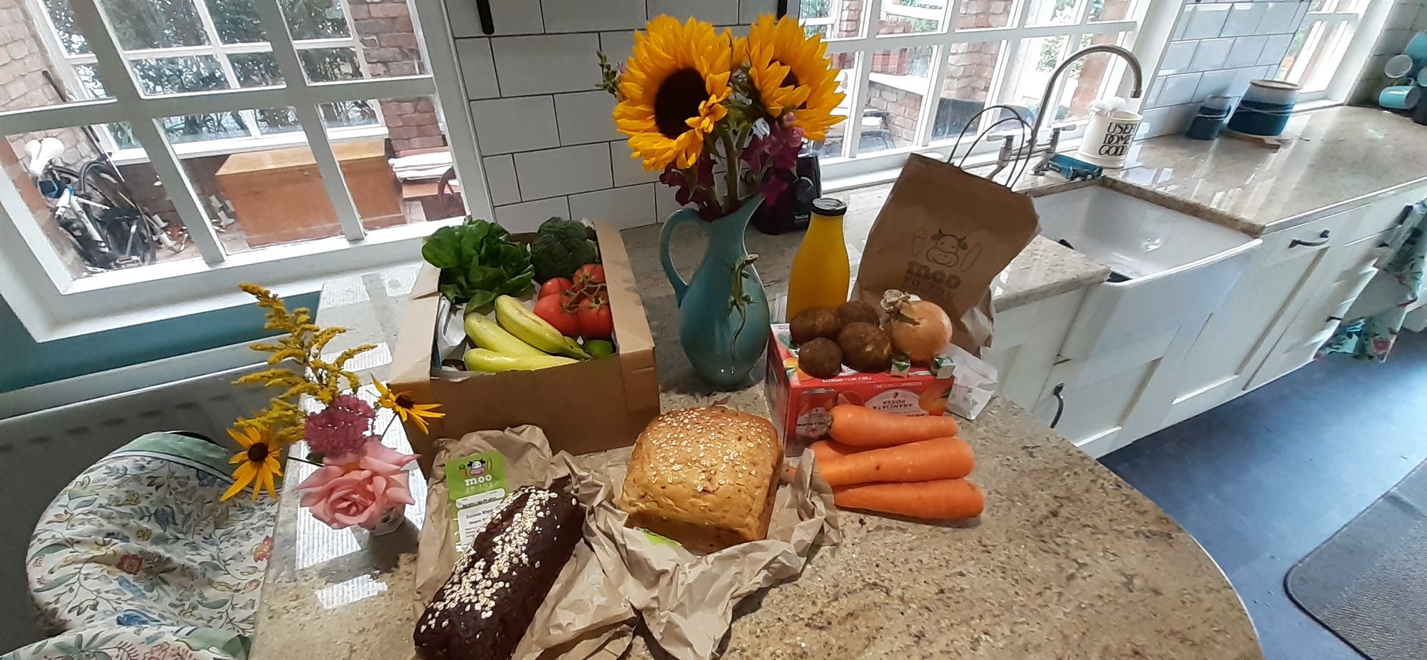 Last night was my book club meeting. I went even though I was only 20% through the book, Toast by Nigel Slater. All book club members were very sorry to hear my news. I've been telling anyone who would listen that mom is coming. I was so excited after so many months of delay and confusion around the rules. I came home last night to a bouquet of sunflowers with no note. I'm guessing Eddis, as I had just told her the news before book club. I have the loveliest friends. (Eddis just called, it wasn't her. Christine?)