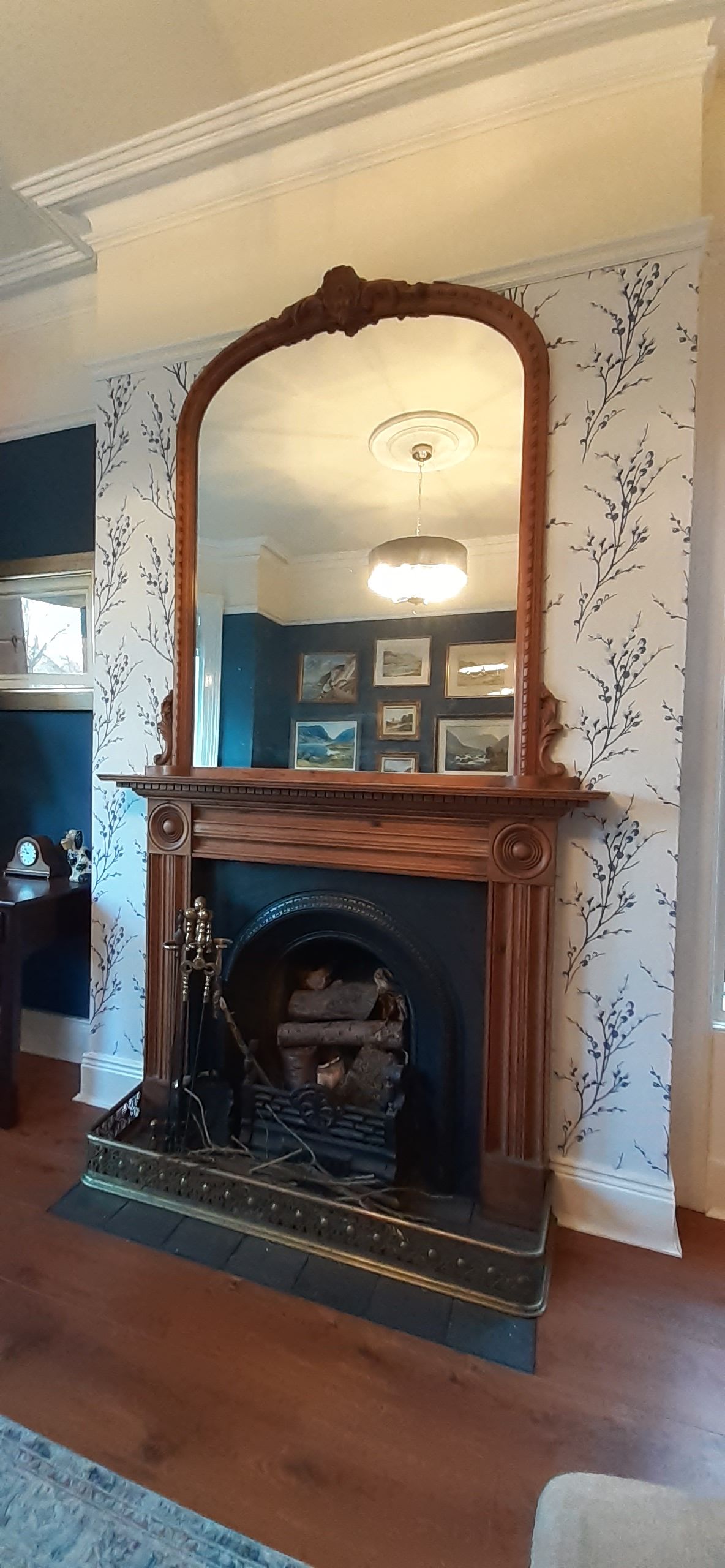 The wall arond the fireplace used to be dark blue like the rest of the room. The effect is to make the fireplace more visible and brighten the room.