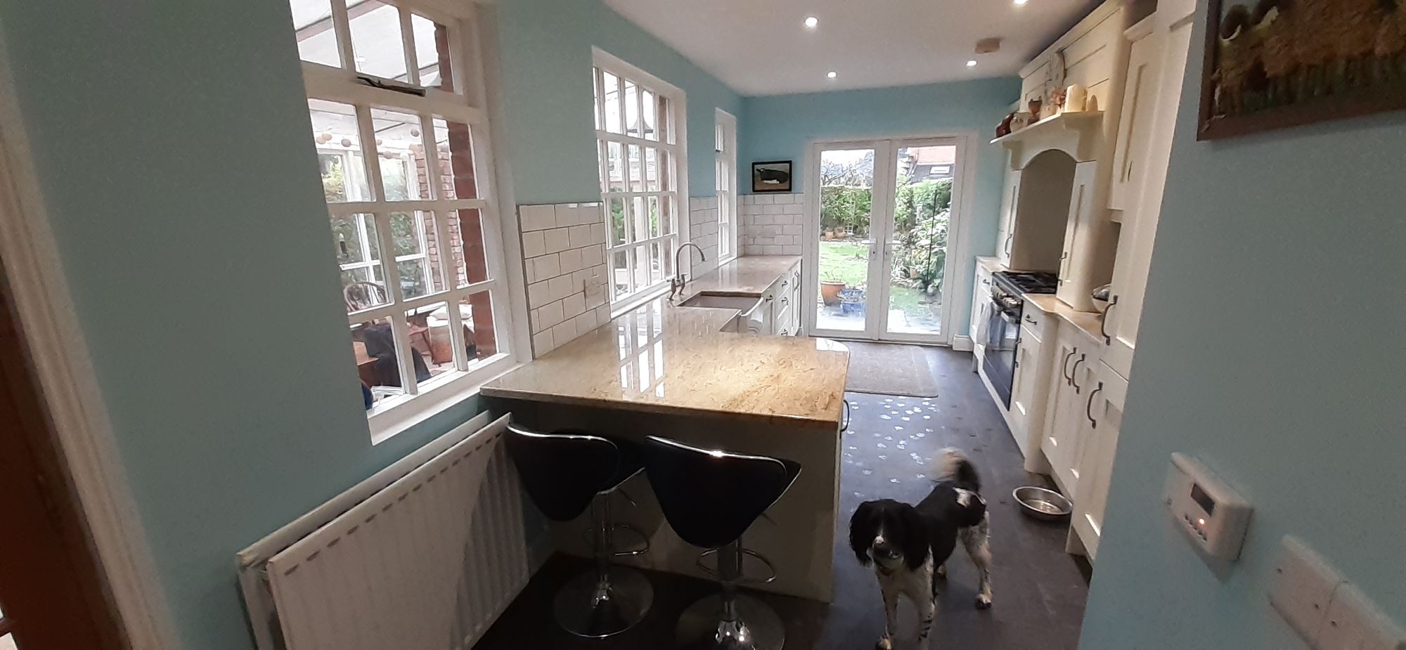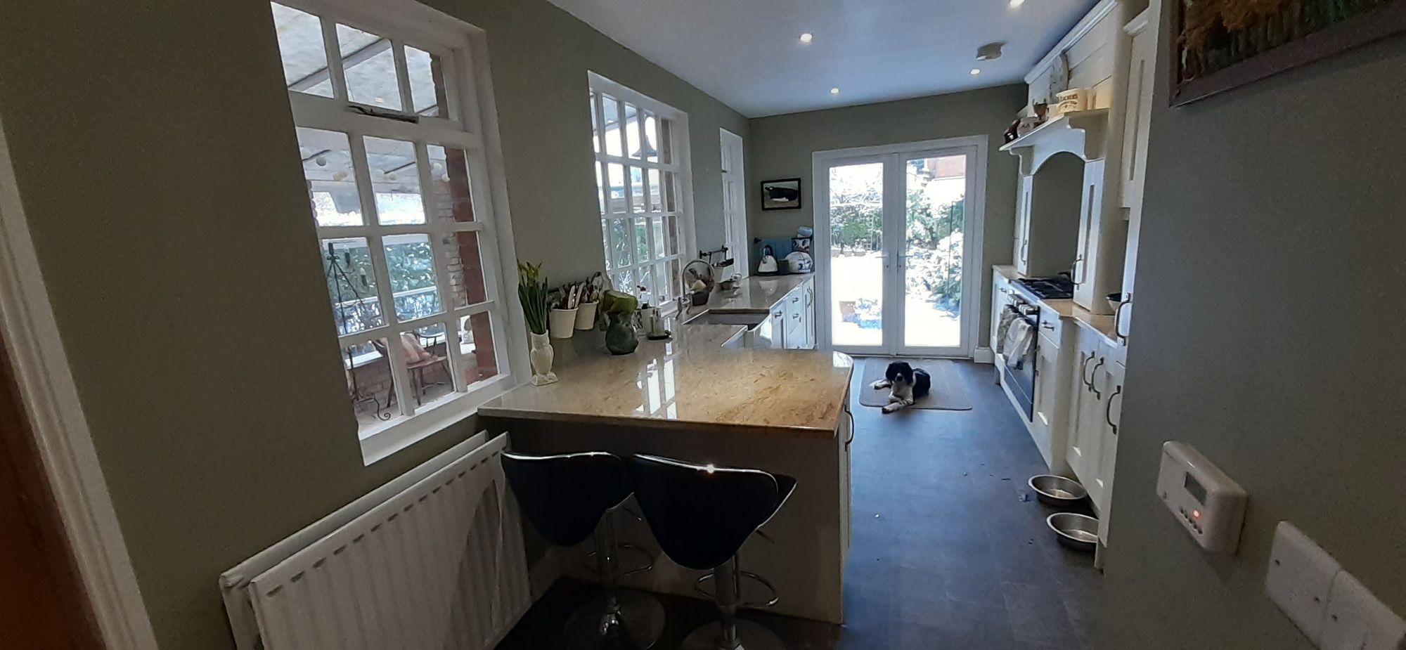 I've been back in the UK for a month. Life in the US was business as usual--restaurants packed, most businesses open. Here in the UK, only grocery stores, chemists, and hardware stores are open. Without much to distract me, I've kept at the home improvement work. All of which takes longer, costs more, is more complicated than I would ever expect. But I'm happy with the results so far. For instance, below is a before photo of the kitchen. The green wall colour is on the olive side of green. A lot of the back garden would be a dark green colour and the kitchen just seems continuous with the outdoors.