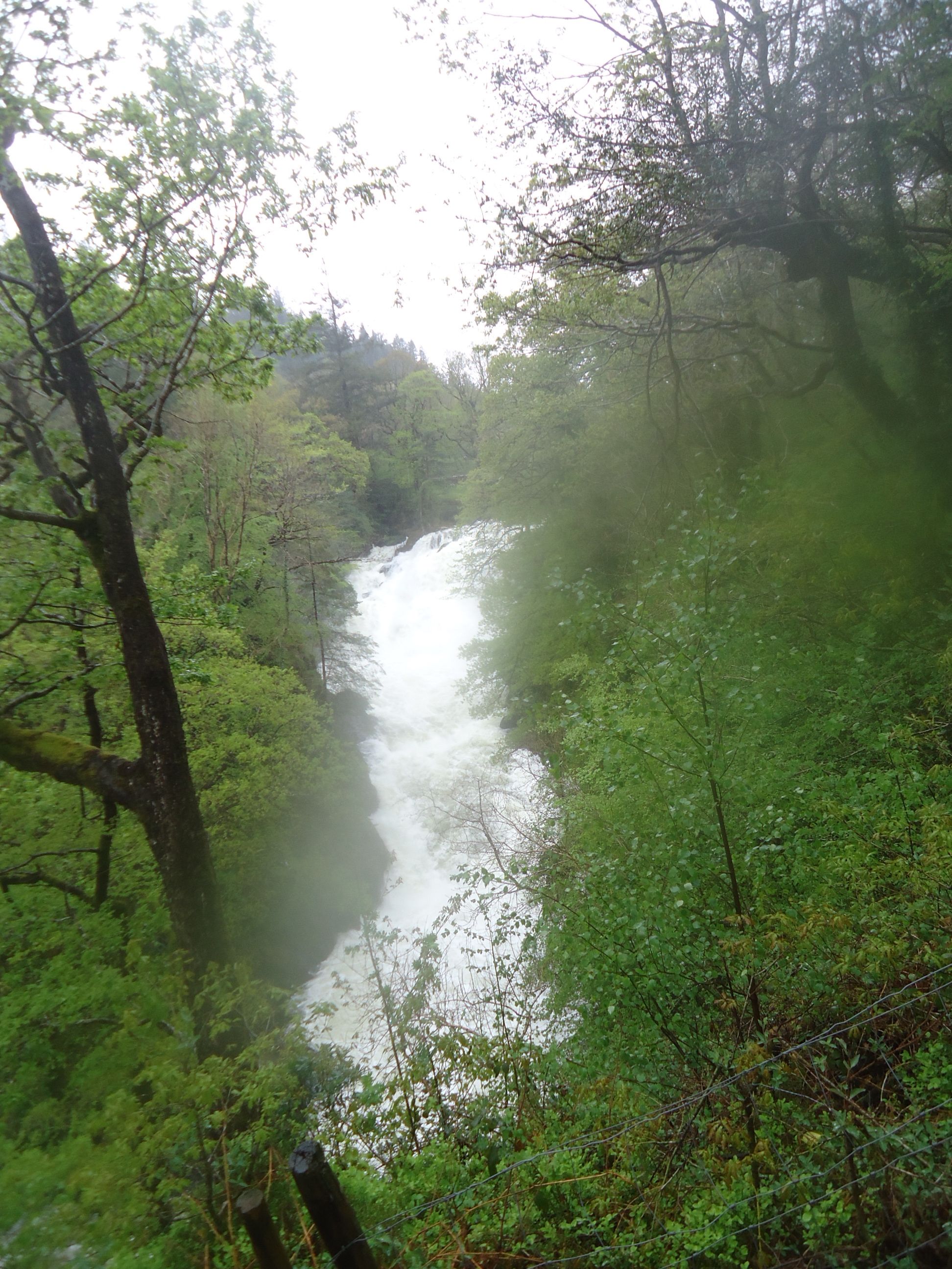 Our hike continued through a hilly and boggy sheep farm. Then down through another forest and along a river to the deafening Swallow Falls.