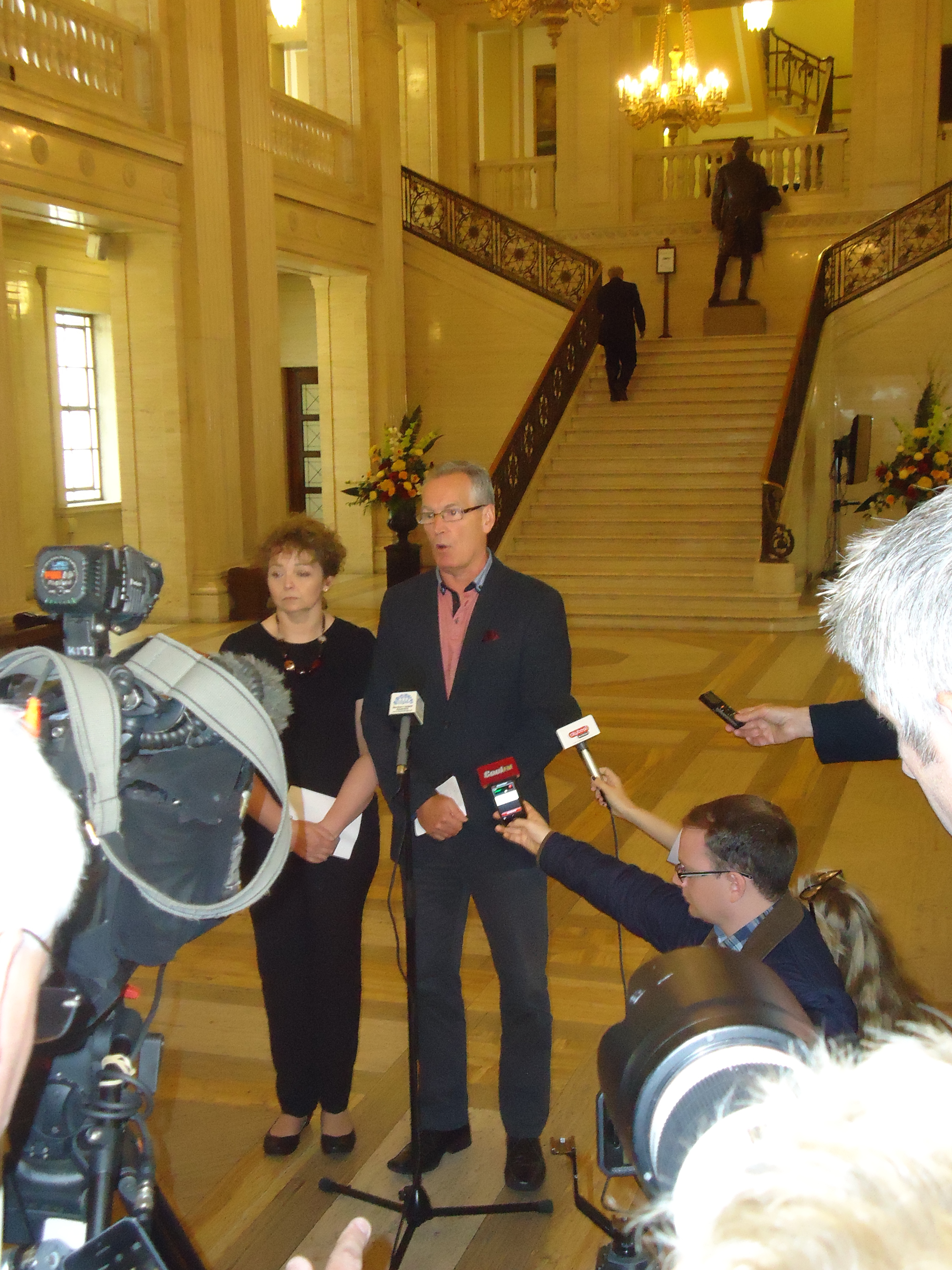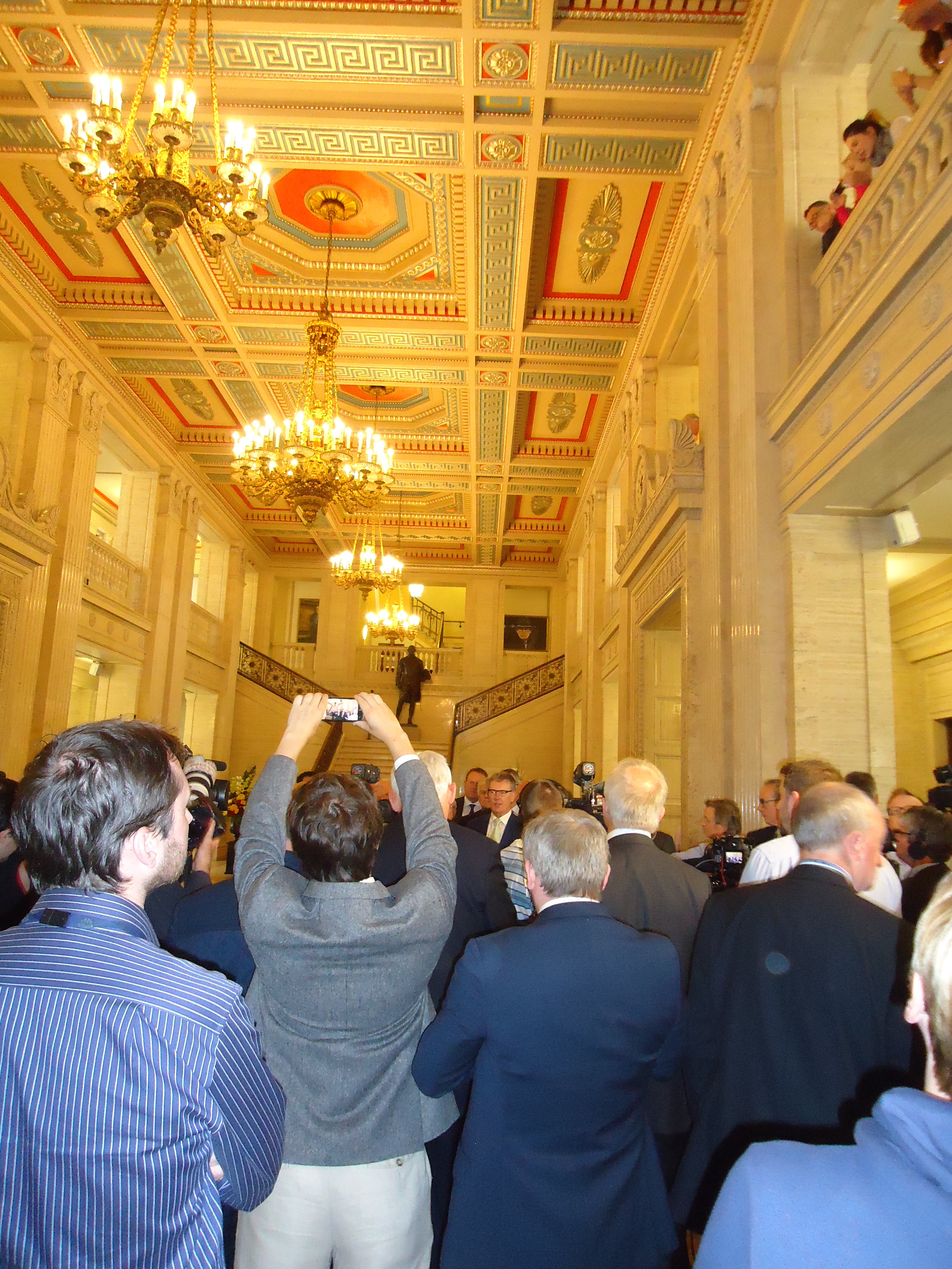 Today was exciting. I met a friend for lunch at the Northern Ireland Assembly, where she works. I went into the lobby to meet her and found a few dozen reporters and camera crews. Apparently there was about to be a big announcement. So you don't get only photos of the incredibly ornate assembly building but also action shots!