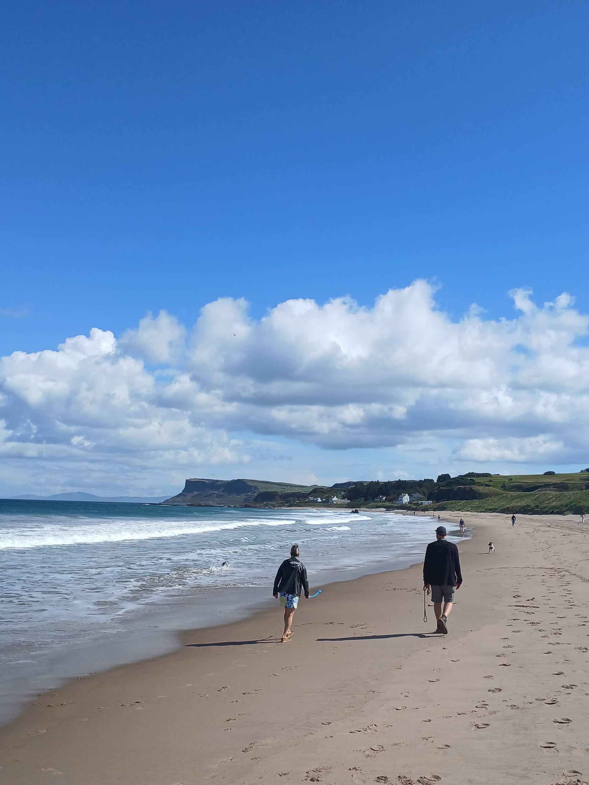 I got home the afternoon of the 25th and my friends Joe and Carlos, from Brooklyn, arrived that evening. The next day we headed north to Ballycastle. Luckily, they like dogs, so the hounds came with us. We released the hounds (Paddy is a dot in the surf and Daphne a dot on the beach).