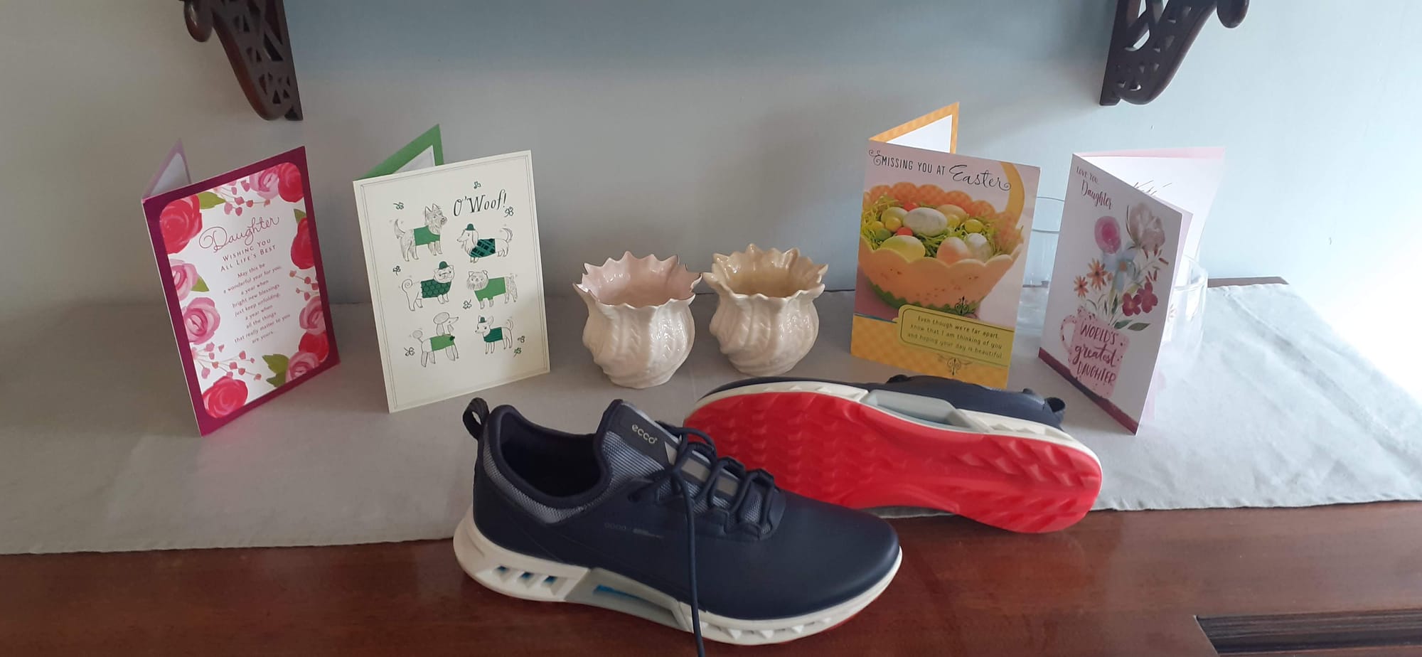 On my birthday, I played in the Bleakley Salver, which is mixed foursomes. We had 35 points, not bad but not good enough to win. I knew mom would send me a check for my birthday so I bought a new pair of golf shoes, which I displayed with four recent cards from my mom.