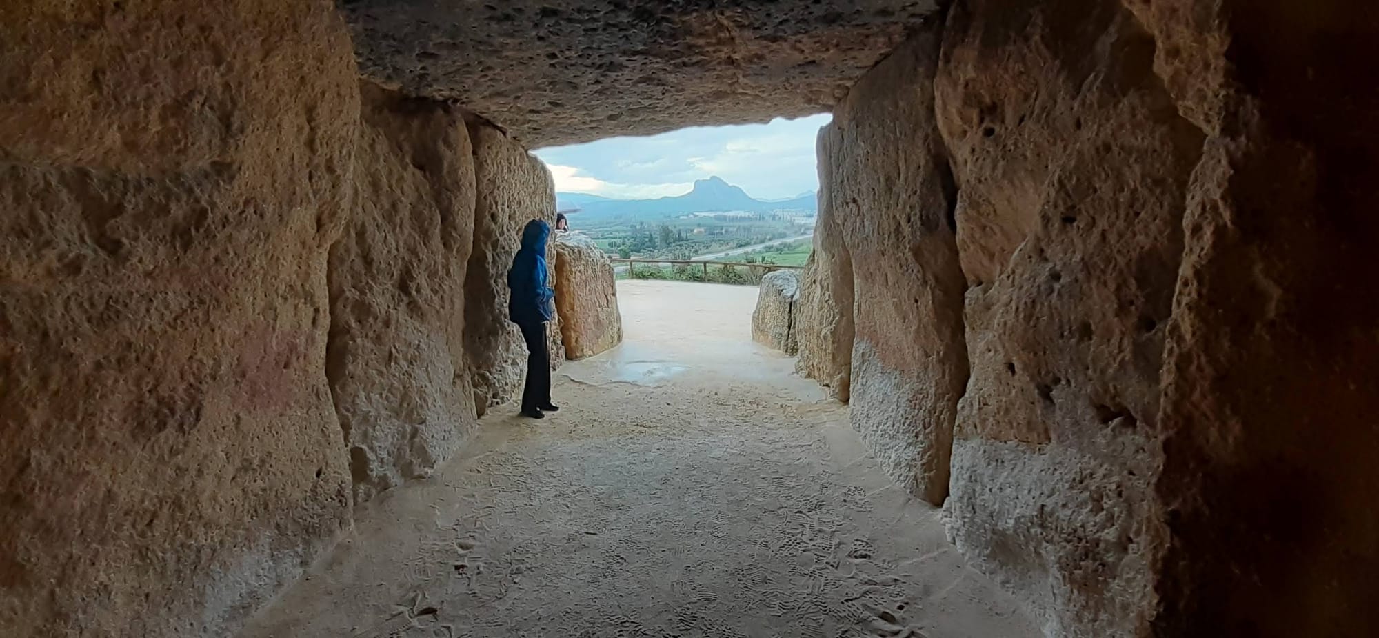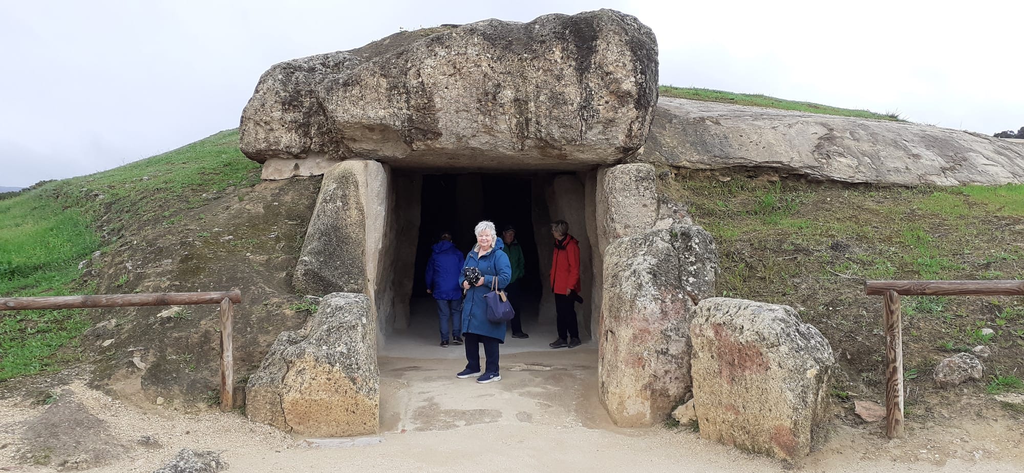 Day one of our trip was spent in Antequera, so named by the Romans because THEY thought it was old. We toured three dolmens. The first was comparatively modern, built 2500 BC. Let's say this domed roof was maybe 15 feet high? Very impressive to build this structure and drag a massive rock across the top to compress the rest of the stones.