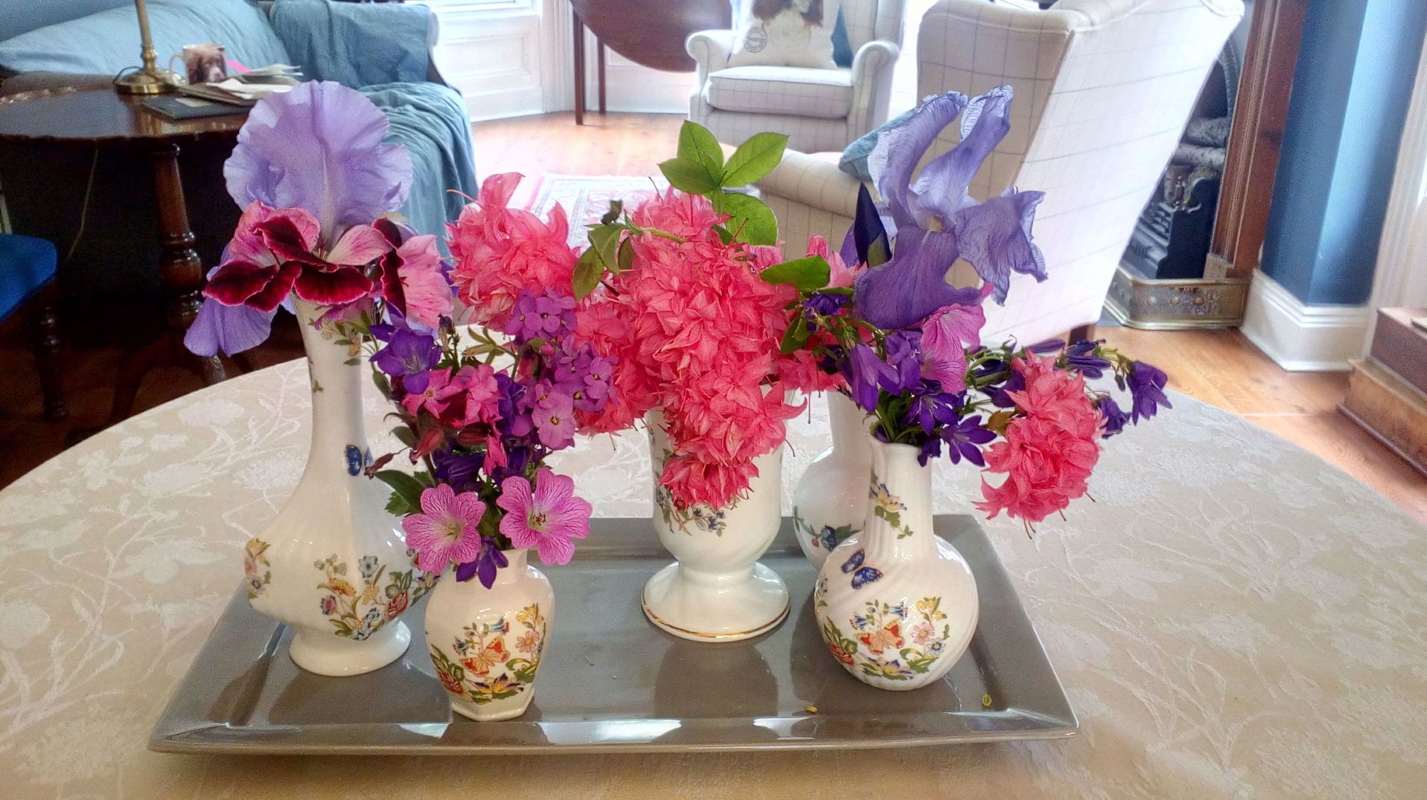 I have not written in the blog for a month! I'm going to do a few random posts. What I learned from mom's photo album is the blog is a good resource for recalling the past, particularly the fun bits. Here's another of my whole-is-greater-than-the-sum-of-the-parts bouquets. Irises, geranium, azalea, forget me nots.
