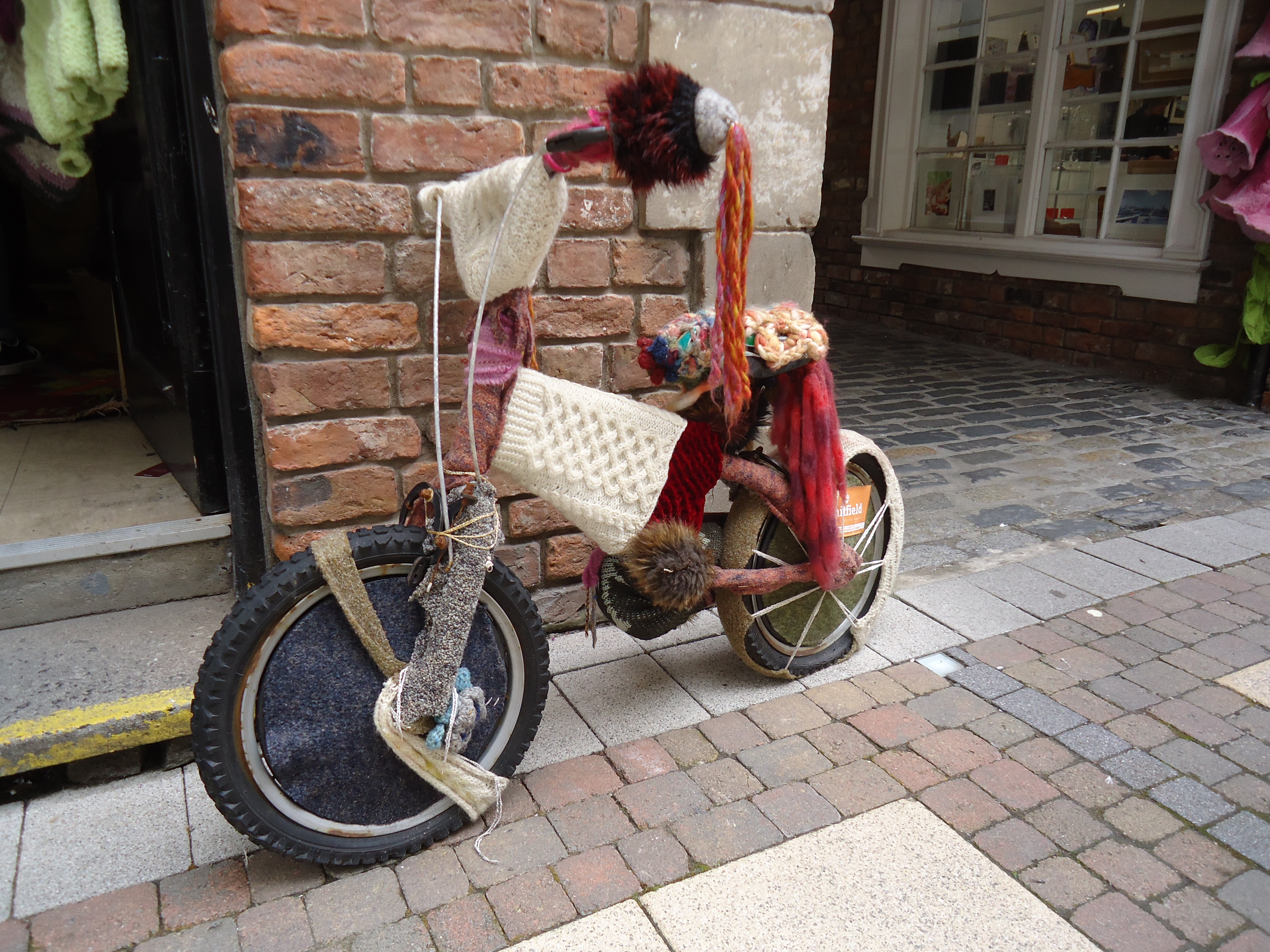 So my goal was to find a painting of Grianan to give as a wedding present to my nephew and his fiancé. At the hotel, I was directed to a gallery in Derry, which became my next stop. I first visited the craft village, where there was a nice yarn bombed bike.