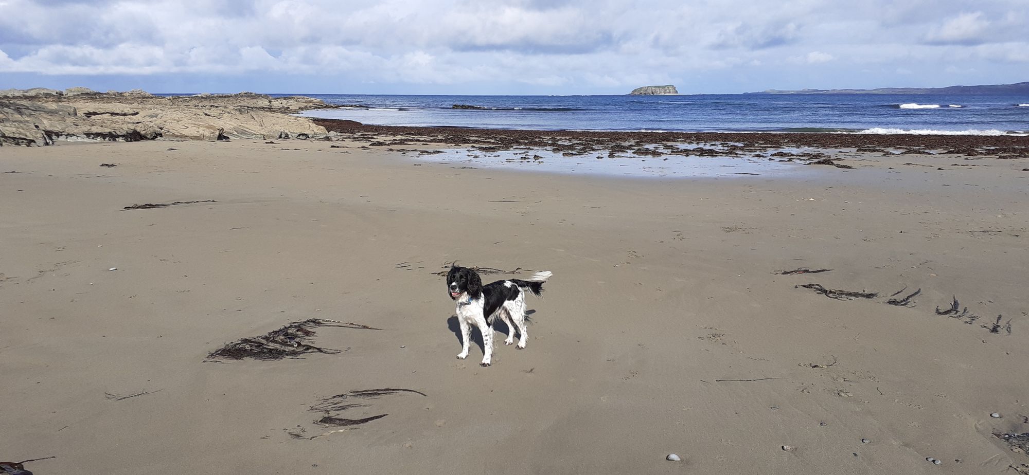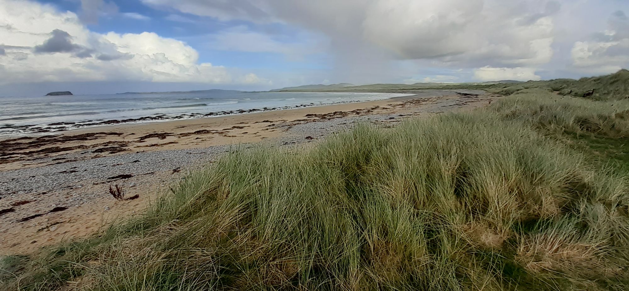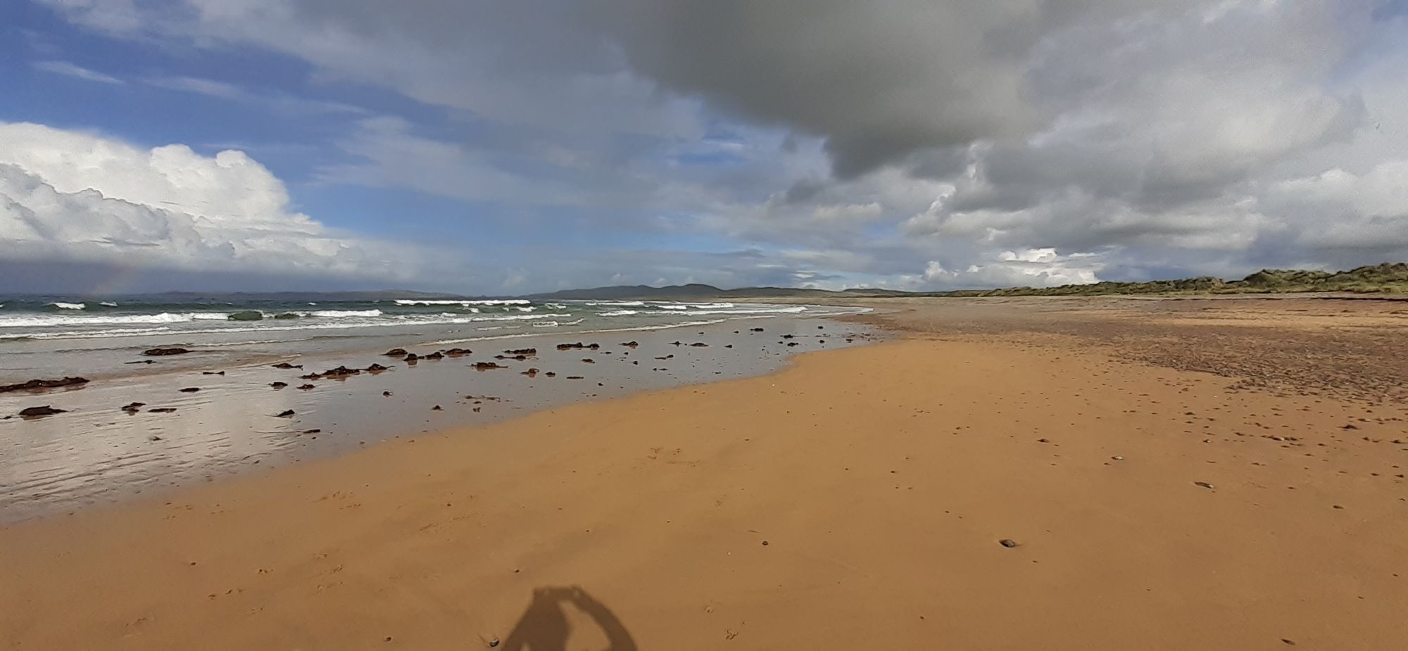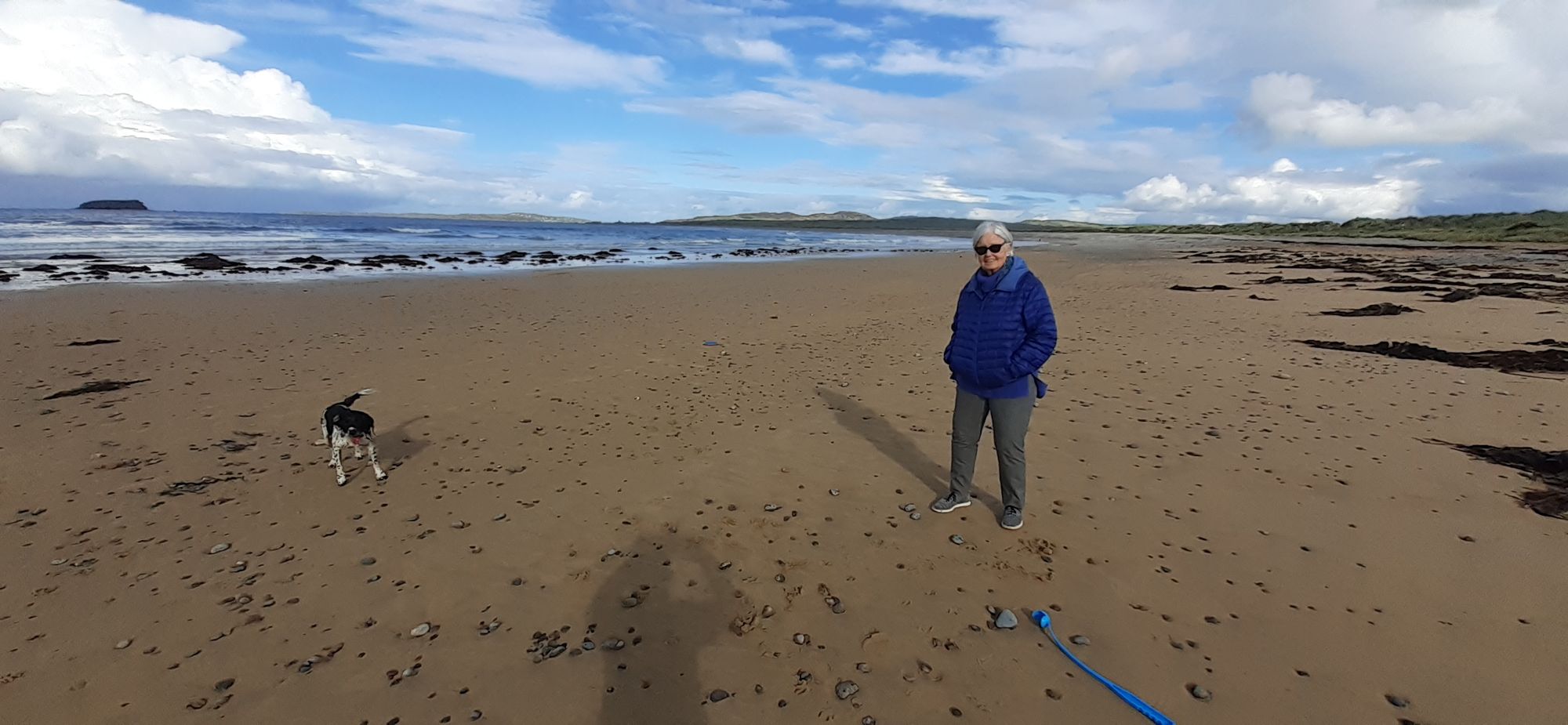 Home to collect mom and then a gorgeous drive first back to Letterkenny, then north to Buncrana, Clonmany, and our goal, Ballyliffin Golf Club. We stopped on the way to let Paddy relieve himself. This is Pollan Bay: