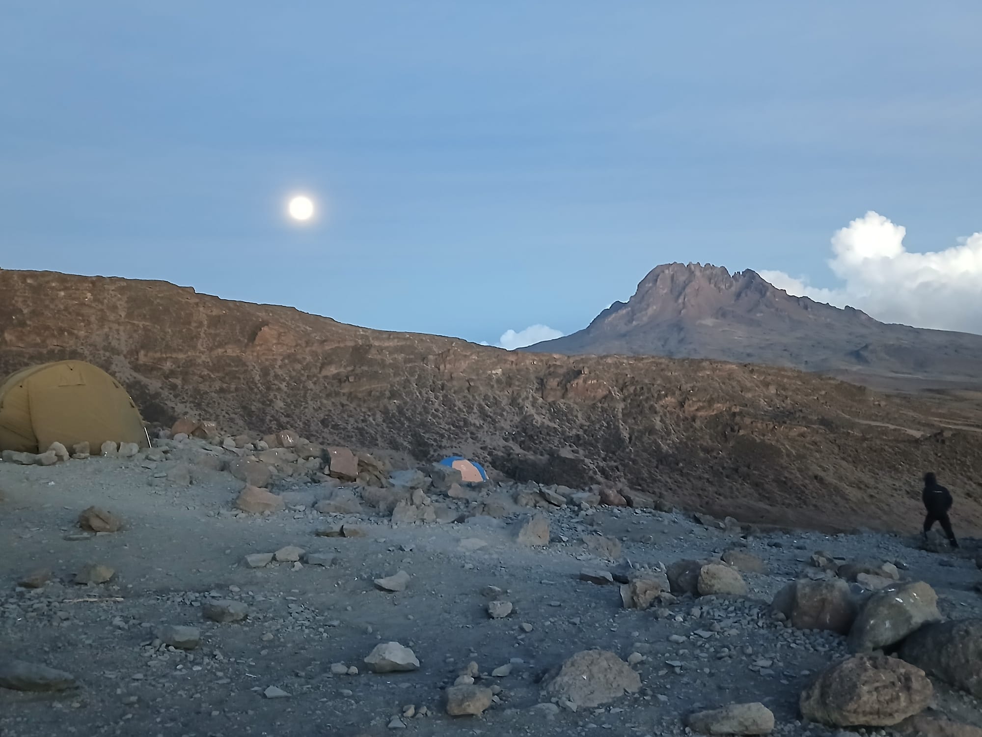 Today's hike was only four hours. At Barafu camp, we had lunch, tried to sleep, had dinner, tried to sleep, and the ascent hike began at 11 pm. I got no sleep as we were exposed to high winds on this ridge so the tent was really noisy.