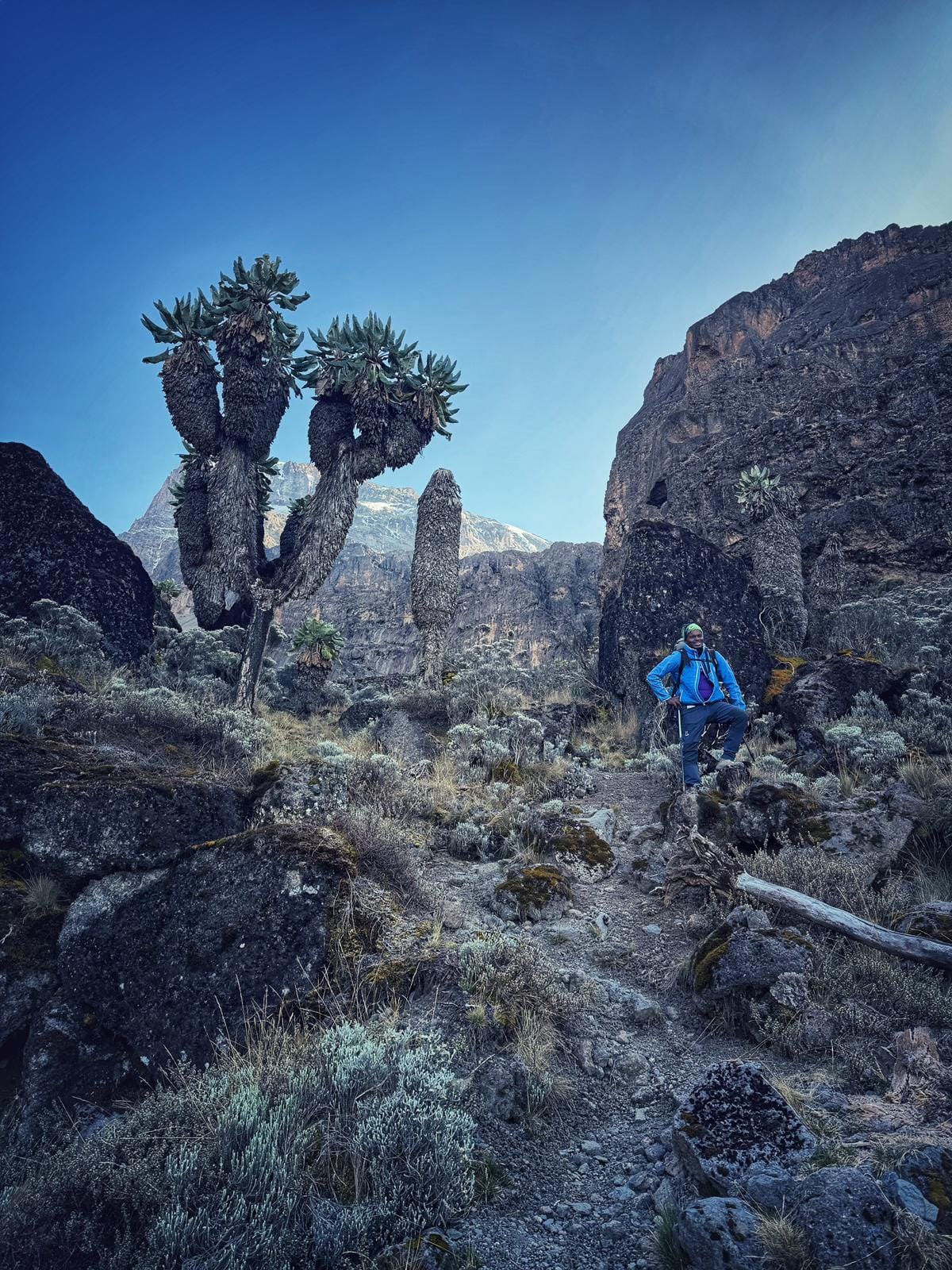 "We continue to the east up a ridge and then head southeast towards the Lava Tower – a 300 ft tall volcanic rock formation. We descend down to Barranco Camp through the strange but beautiful Senecio Forest to an altitude of 13,000 ft. Although you begin and end the day at the same elevation, the time spent at higher altitude is very beneficial for acclimatization."