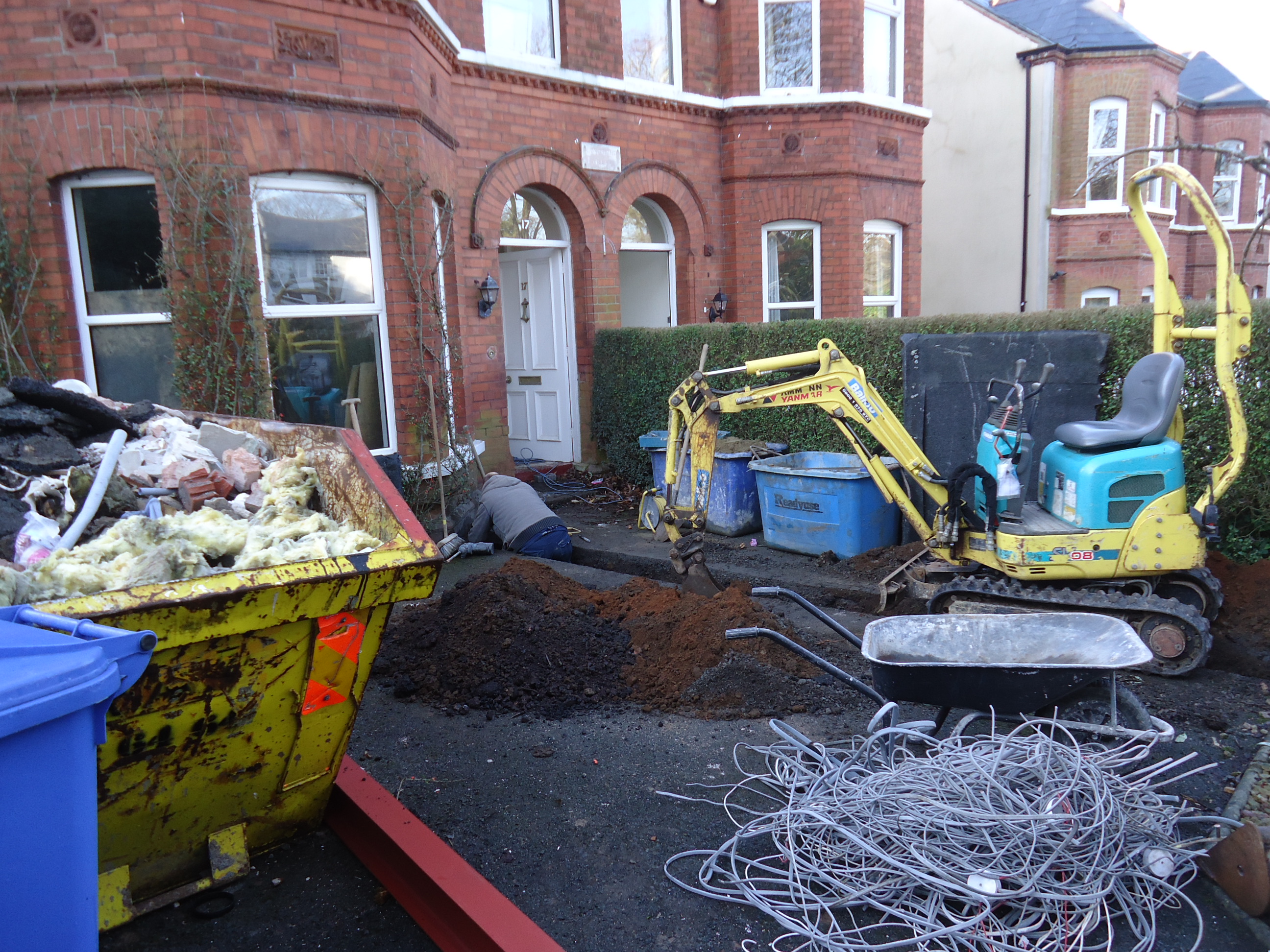 Here's a "during" shot, when a new water line is being laid. The front door is now on the right, where it belongs.