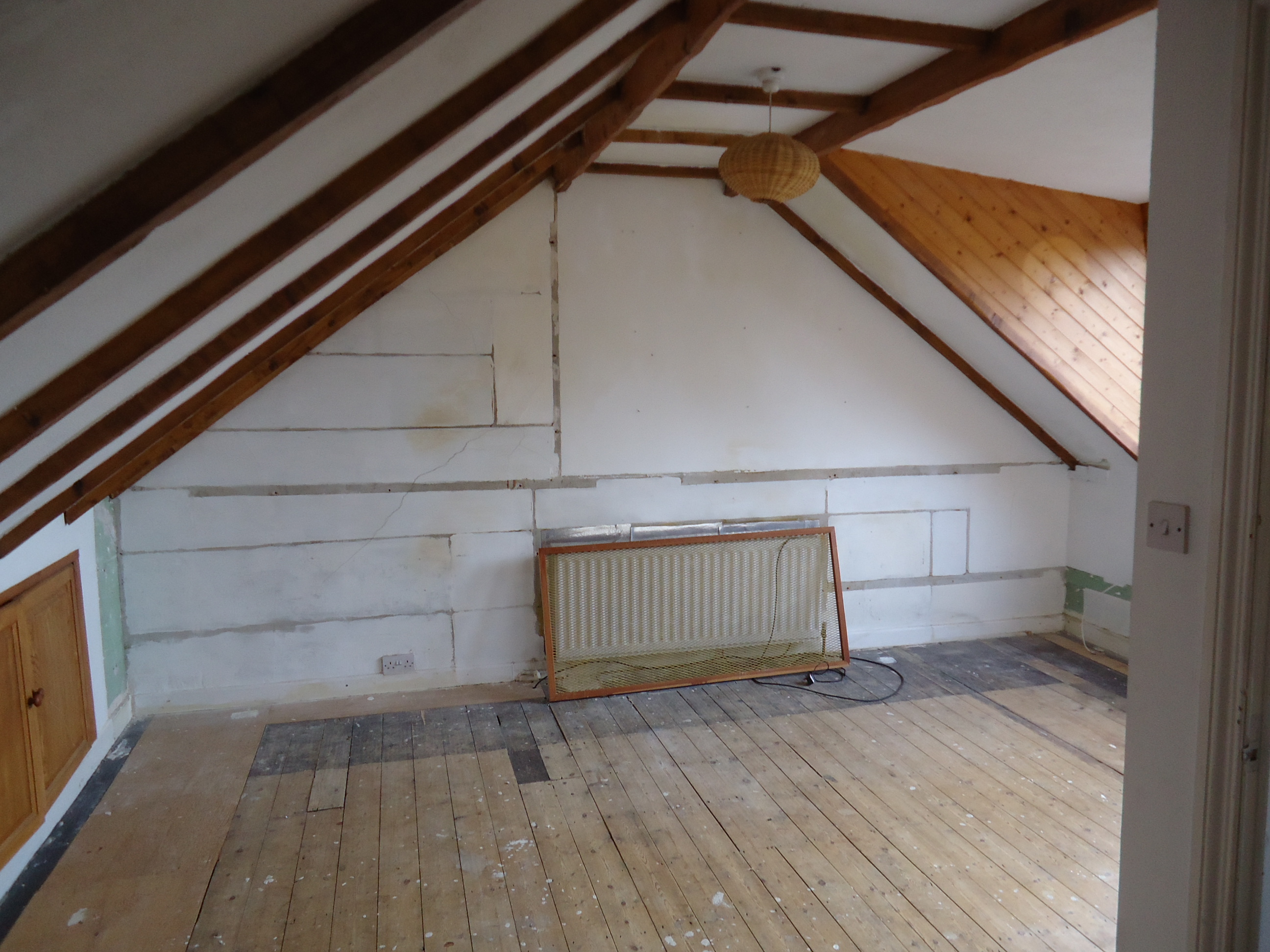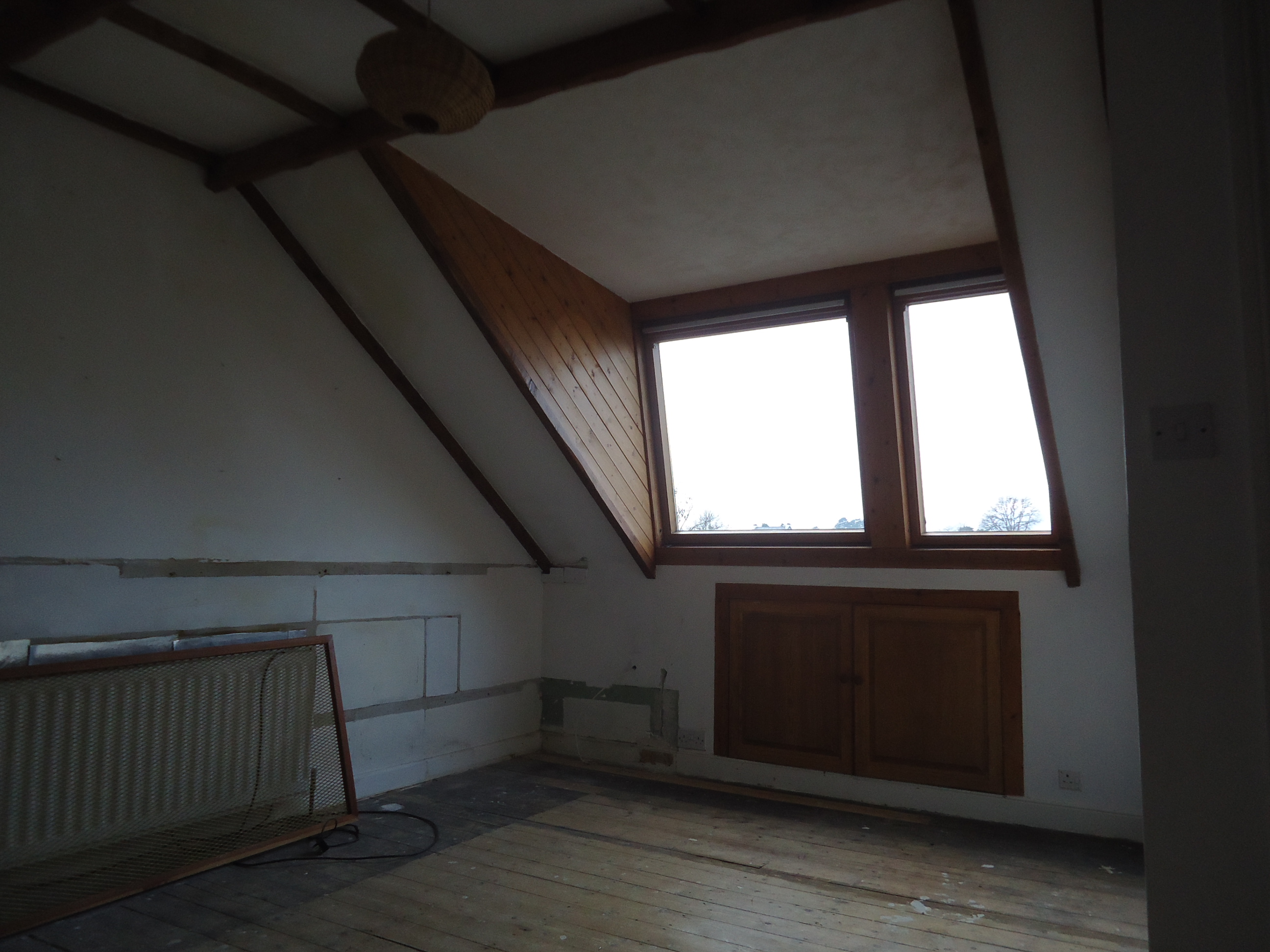 This odd window will be replaced by a wider dormer window, so the dropped ceiling on either side will be lifted.