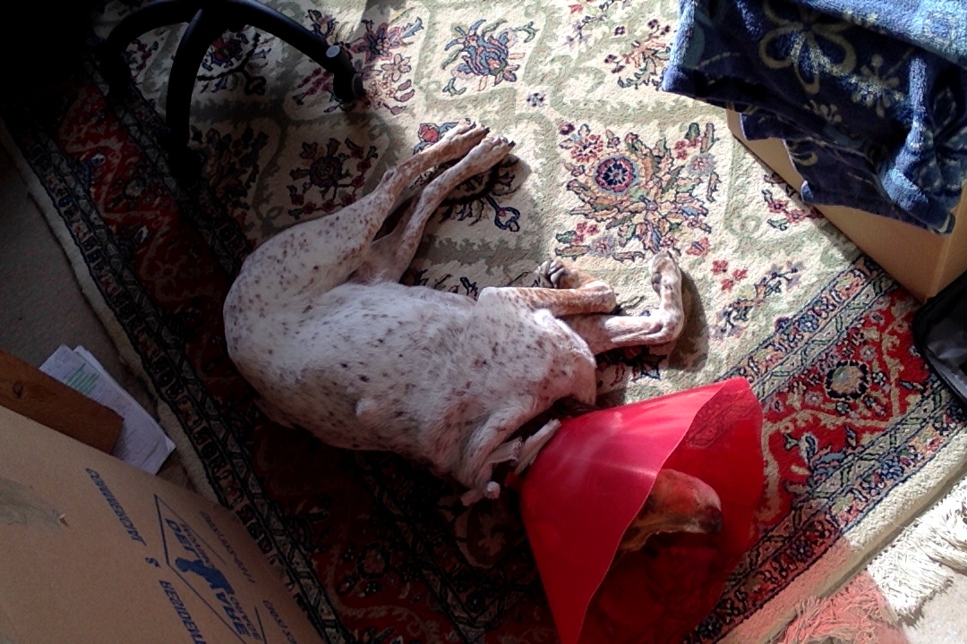 Our poor Maysie dog woke up this morning and was shaking and unwilling to walk. We took her to the vet and found that one of her fatty lumps was infected. Now she must wear the dreaded cone.