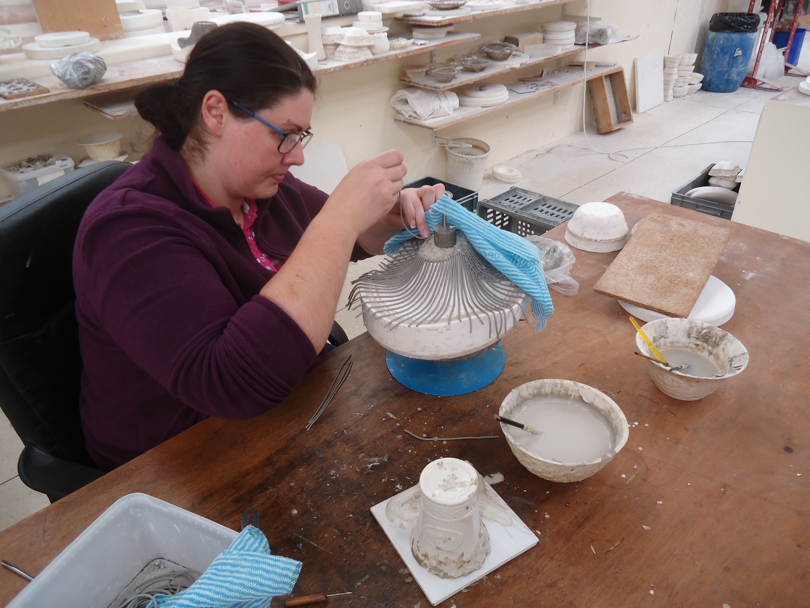 This woman is making a Belleek woven basket. Wet strips of clay are laid on a diagonal and connected to the woven base. Then more strips are laid on a diagonal in the opposite direction. Mindblowing.