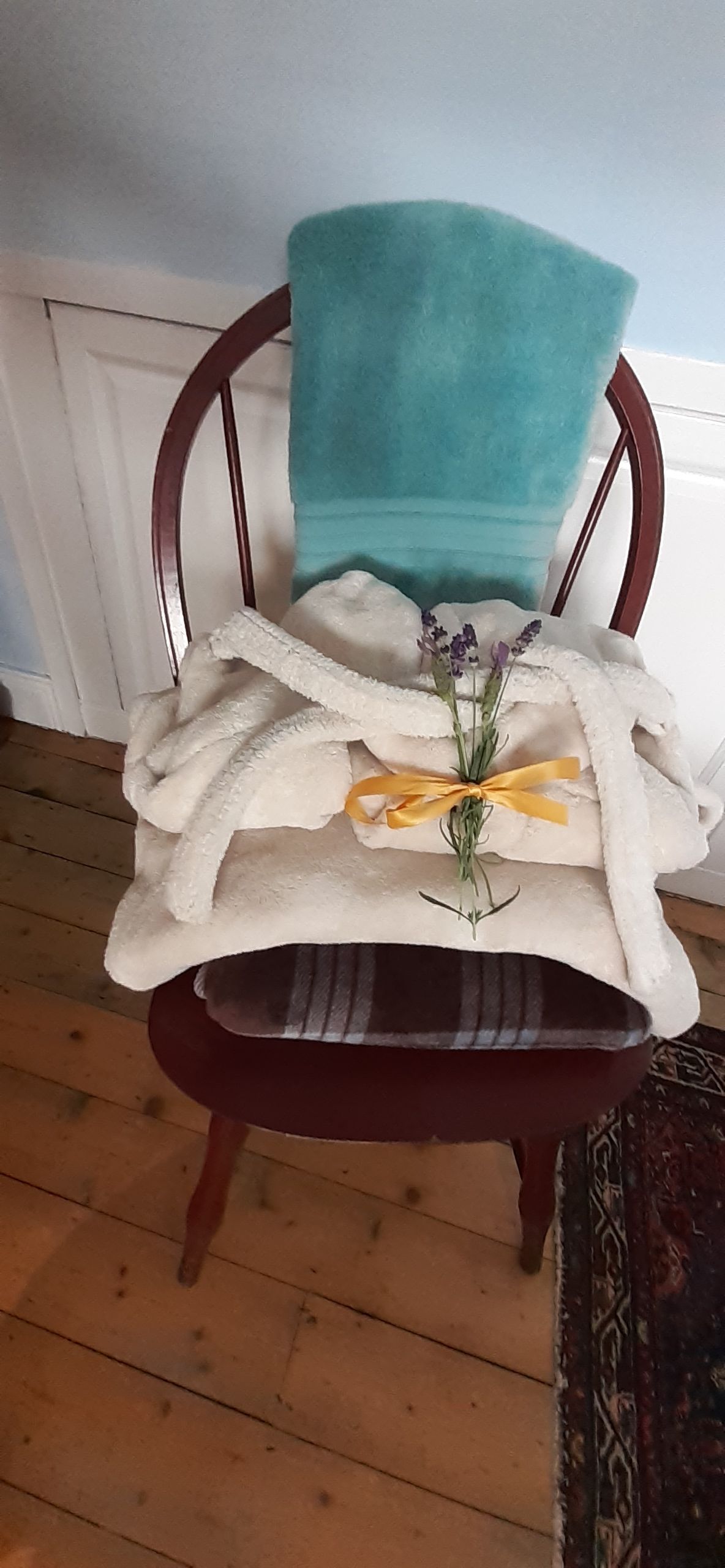 And here's a freshly laundered robe with some lavender from the garden and a fleece blanket and towel.