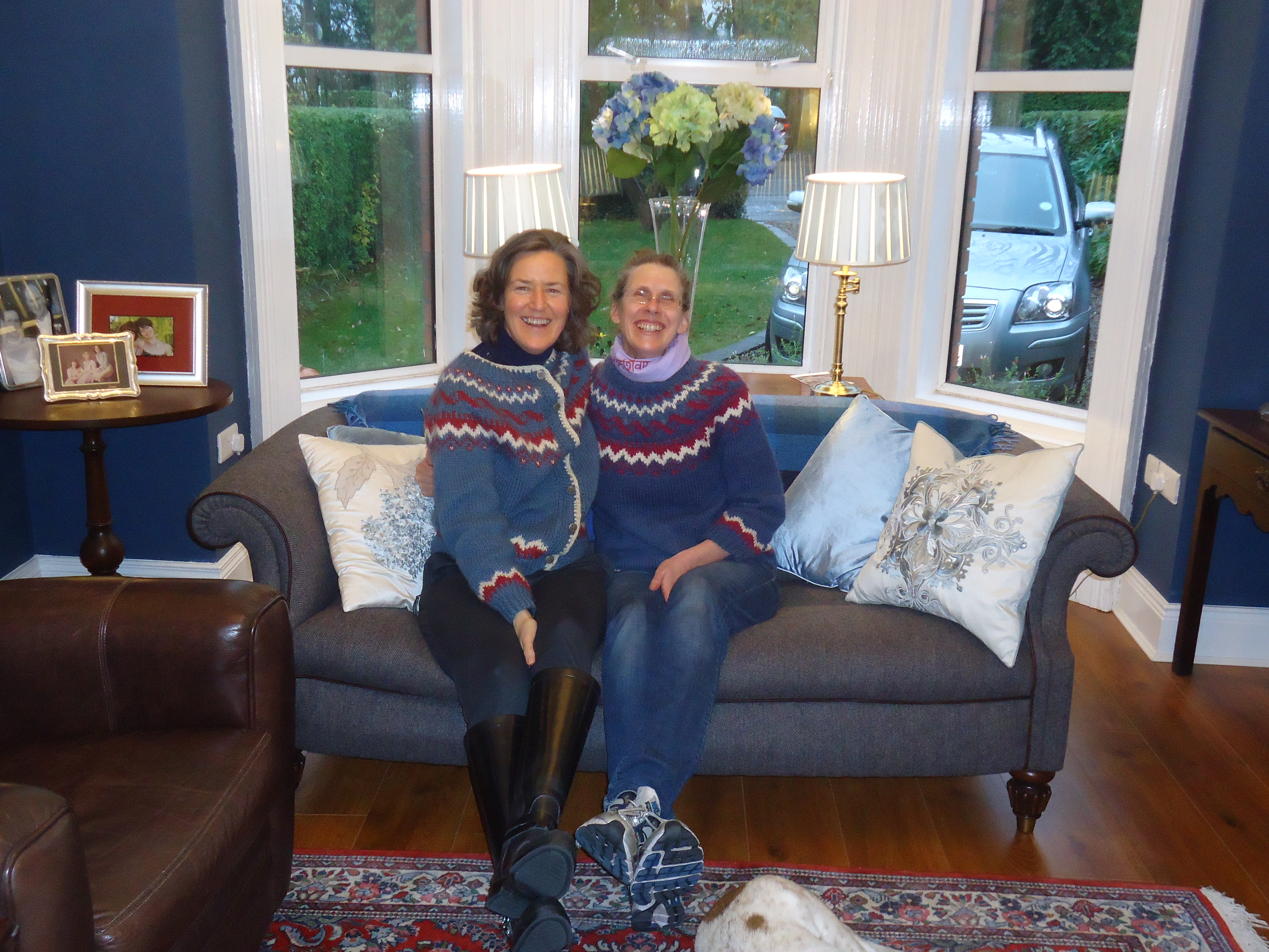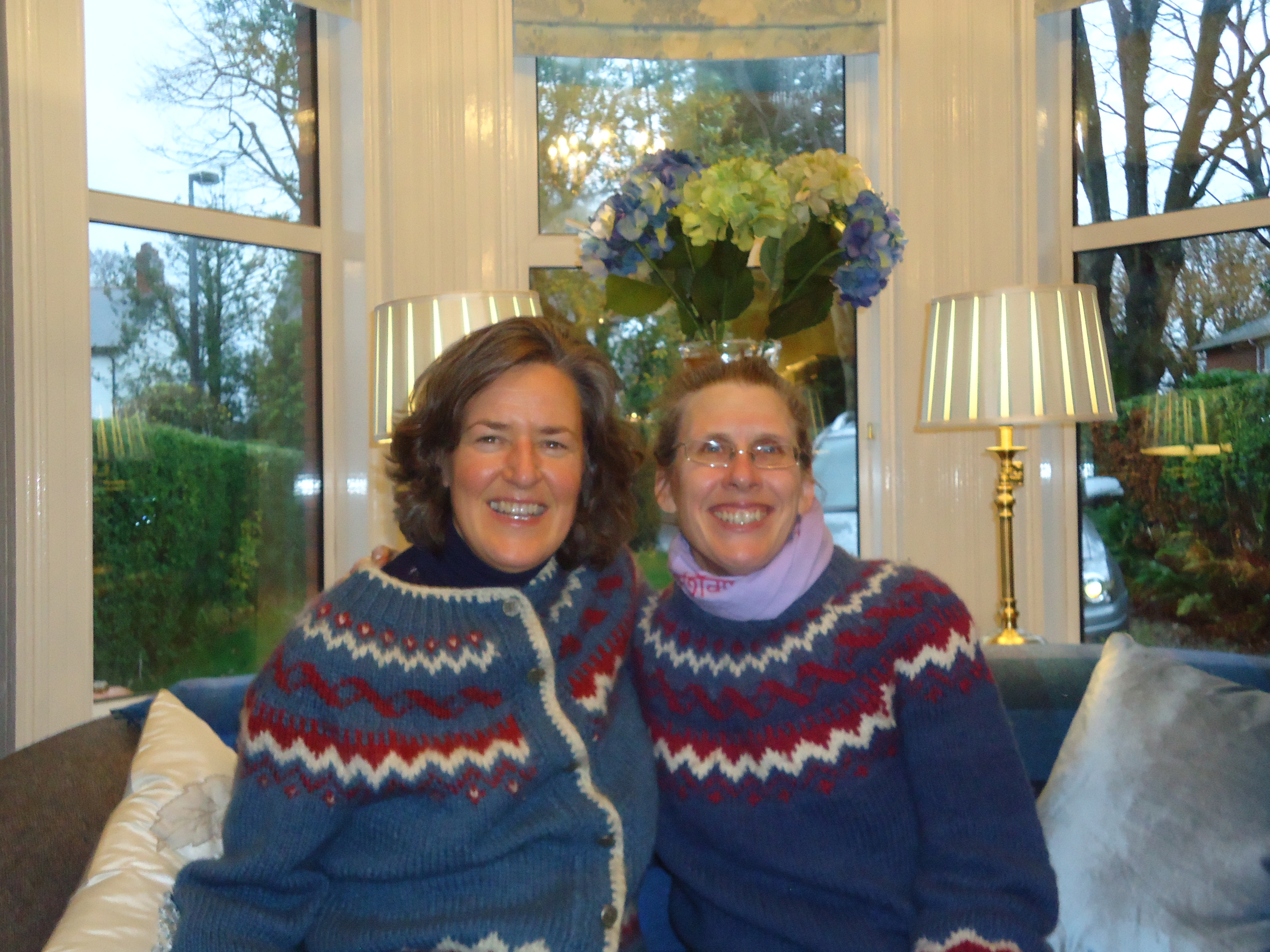 My high school buddy Julie was in town today so we met for another intense gabfest. I’m not sure if I mentioned after her last visit that my mom made a sweater for Julie before we moved back to the states in 1980. Julie shrunk it while in college and has been mourning its loss ever since. A month ago, I gave her an identical one my mom made for me and she showed up today wearing it, creating a photo opportunity. Here we are both modelling my mom’s handiwork.