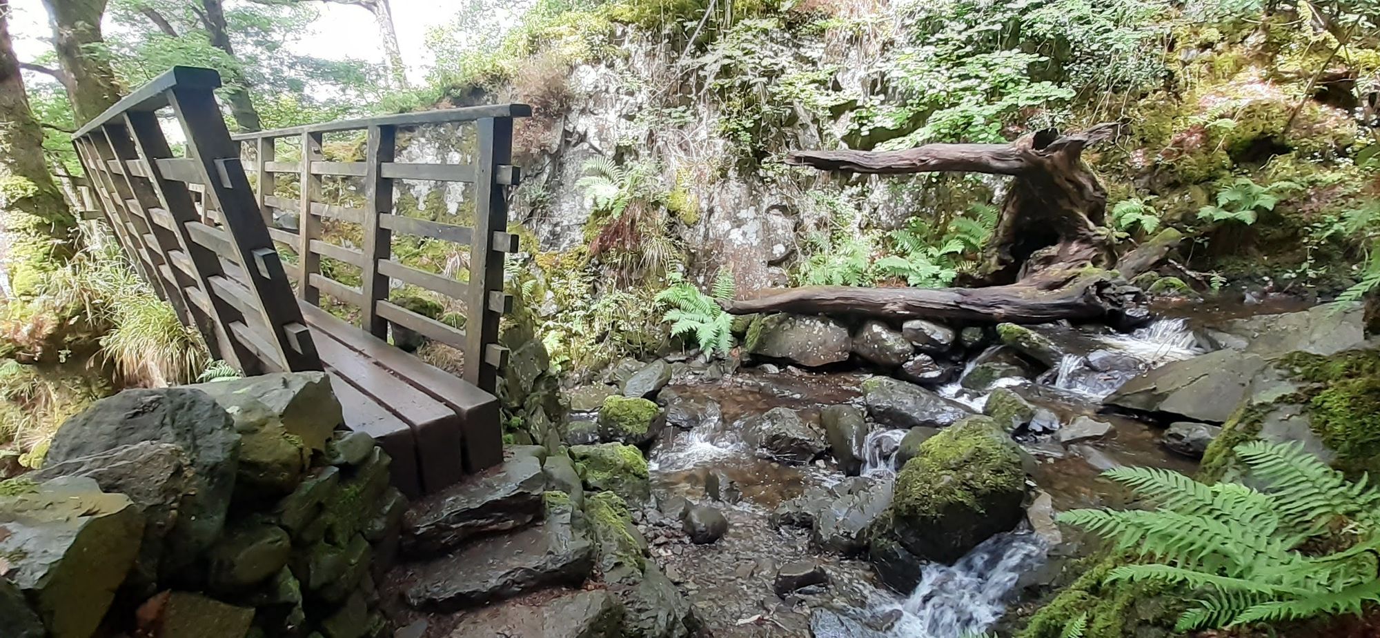 The distance was 10.5 miles, ascent 2,200 feet. Description: "After a short coach ride we begin at Springs Farm we ascend steadily alongside Brockley Beck to emerge on the open top of Walla Crag. There are superb views over the lake, town and surrounding fells. We continue up to the summits of Bleaberry Fell and High Seat, before descending to the much photographed Ashness Bridge, from where we follow woodland paths to Derwentwater. We follow the shoreline back to Keswick then on to the house."