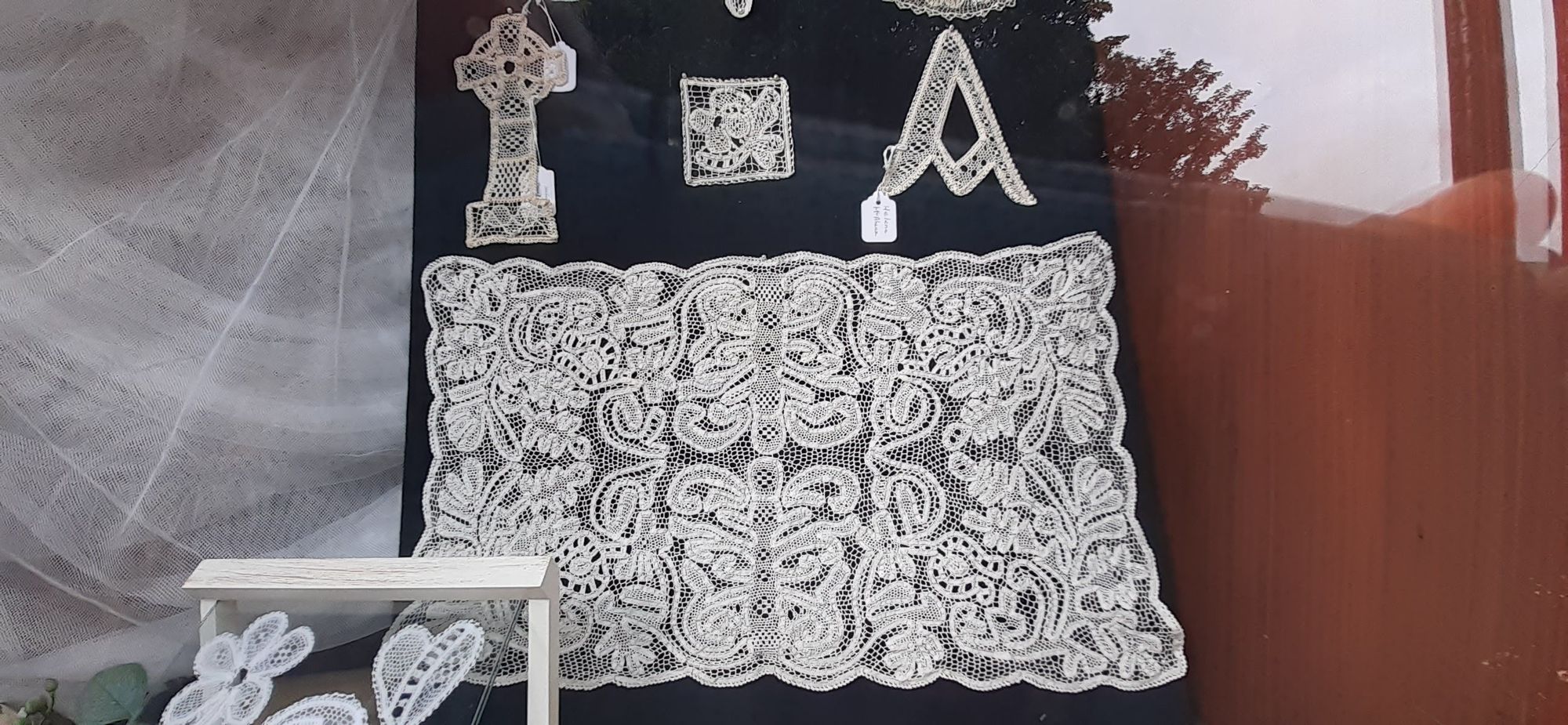 During one of the breaks I went for a long walk around Borris, which apparently was famous for lace making. All of the pubs have displays of lace in the windows. An odd combination! The tags list the names of the women who created the lace.
