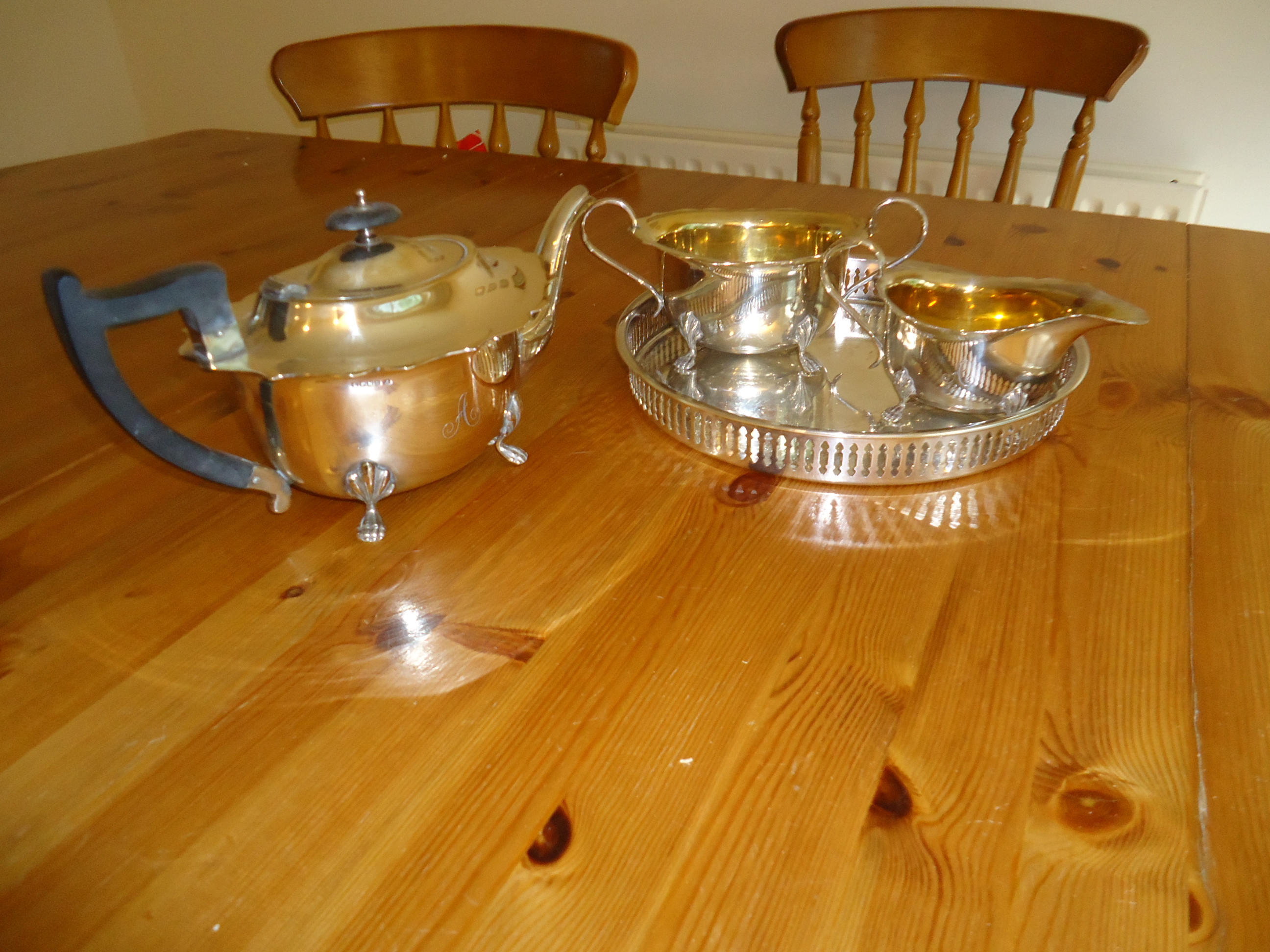 Last summer I was in a charity shop and I saw this service, which I had to buy because of the beautiful "A" monogram (which you can't make out, unfortunately). The lovely tray is from my mom.