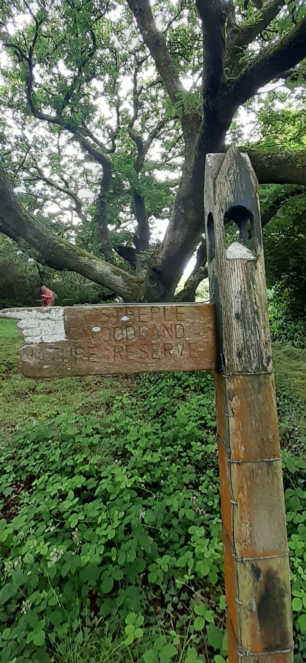 Today we started hiking from St. Ives up through Steeple Woodland Nature Reserve--it was odd to be in the trees after so long on the coast. I loved this marker with its steeple! What looks like a robin on the painted hand is one of the hikers.