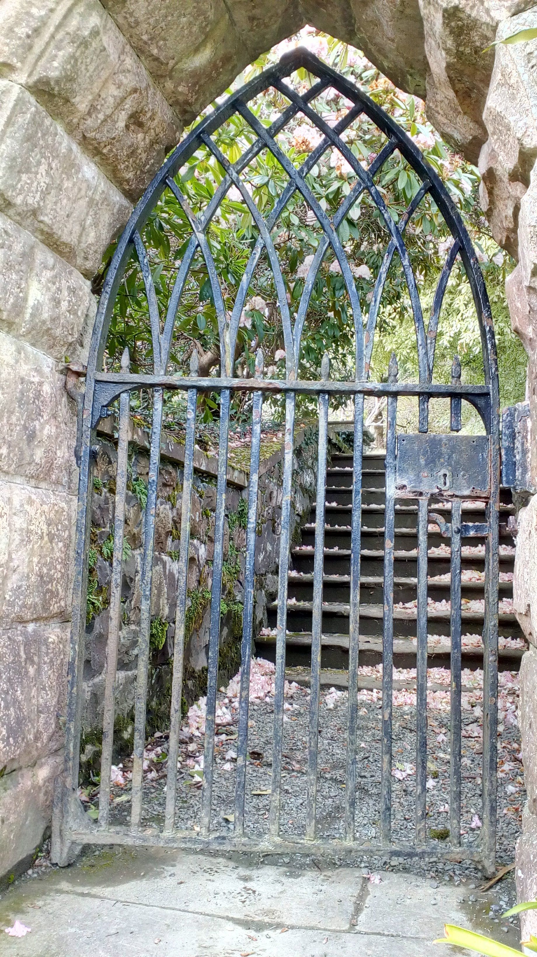 Behind the gothic gate is an azalea covered in pink blooms, a bit hard to see.