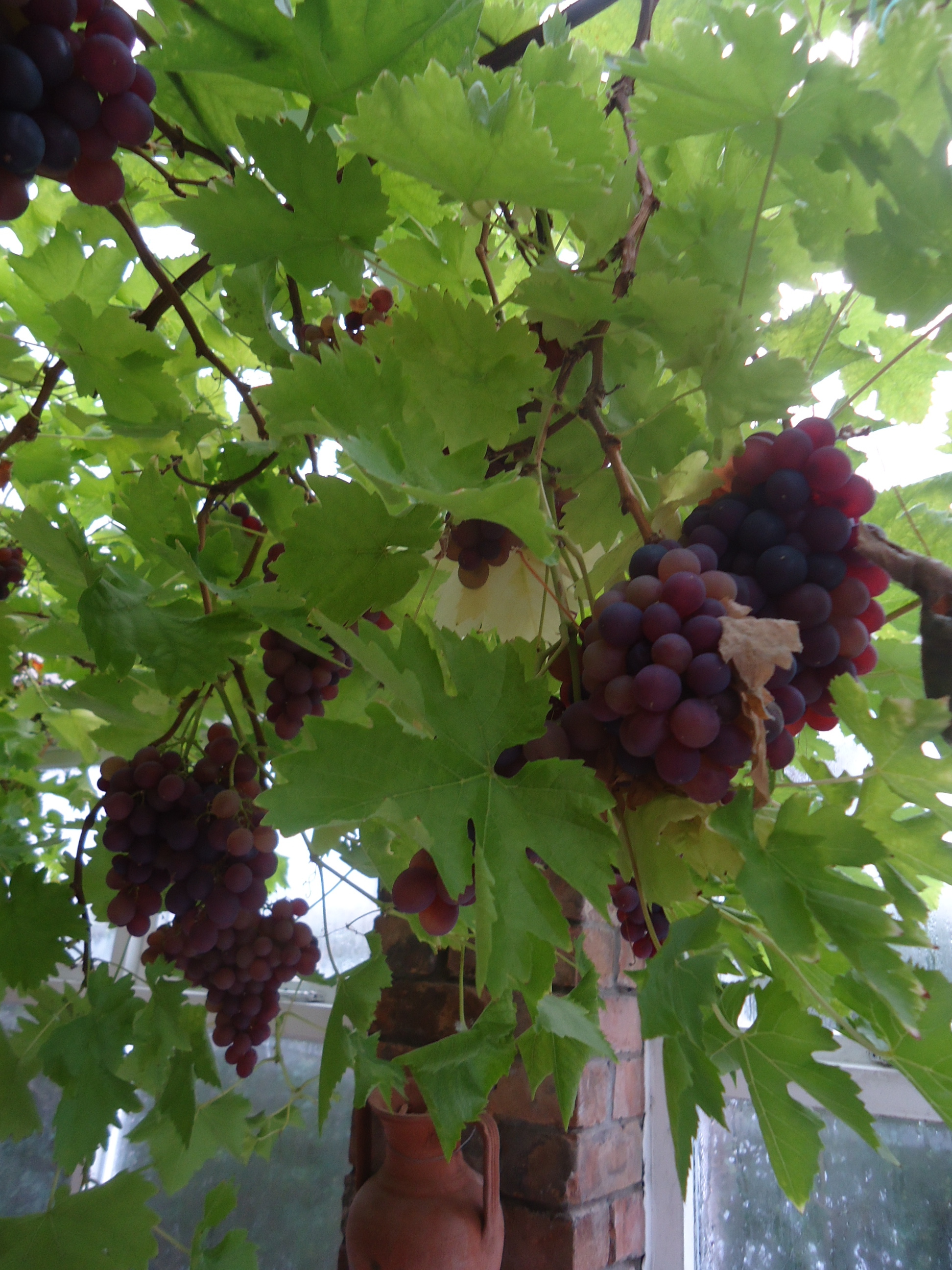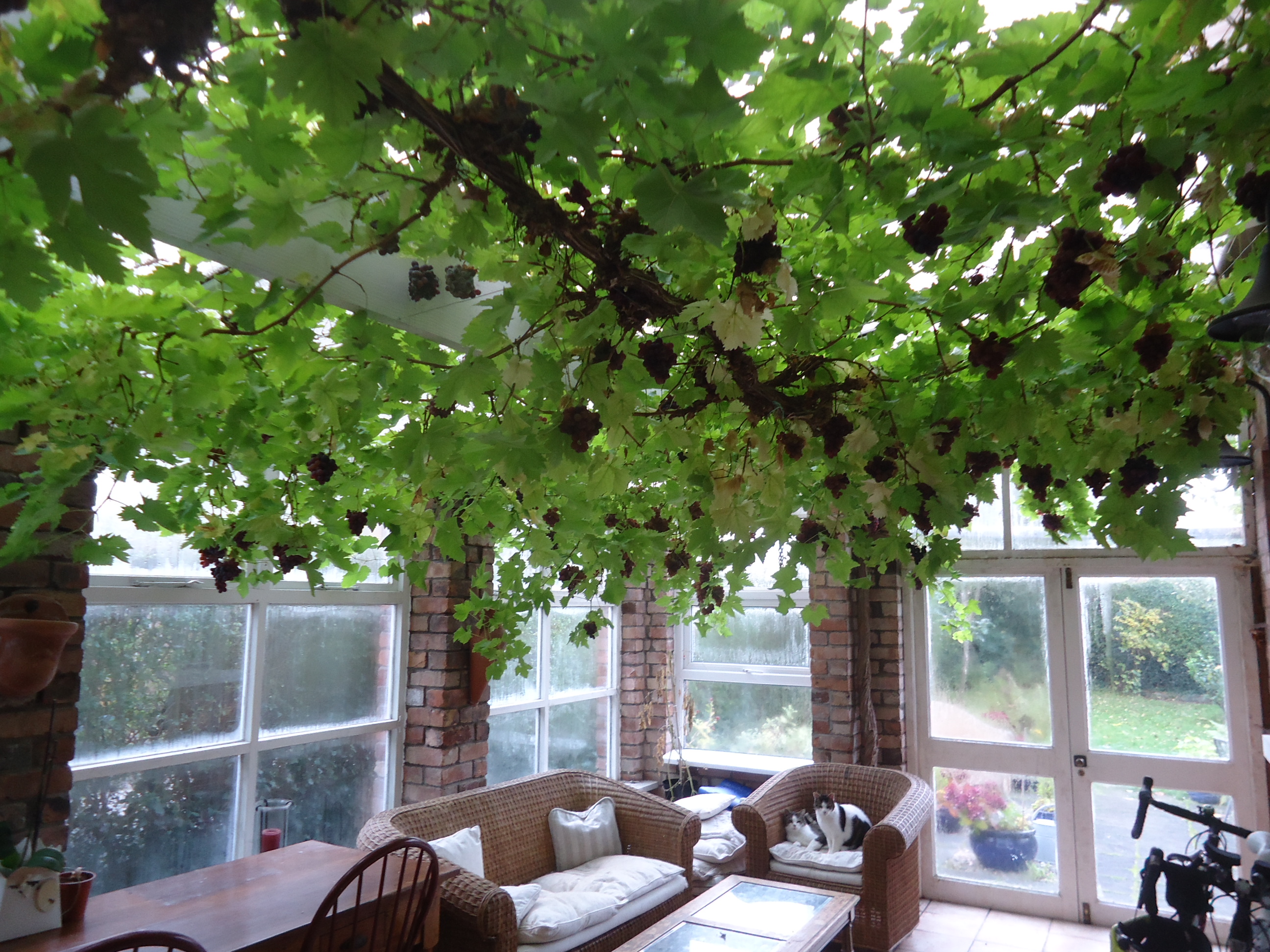 The grapevine covers the ceiling of the conservatory. The grapes are sweet and lovely. They have seeds that are very crunchy, which I’ve come to enjoy as part of my fruit/yoghurt/seed breakfast. We’ve abandoned the conservatory to the cats--we just use it for storage. Our cats have their claws so we don’t want them in the house unsupervised. So the conservatory is full of cat hair, cat litter, and cat vomit. I love my kitties, but they create quite a mess.