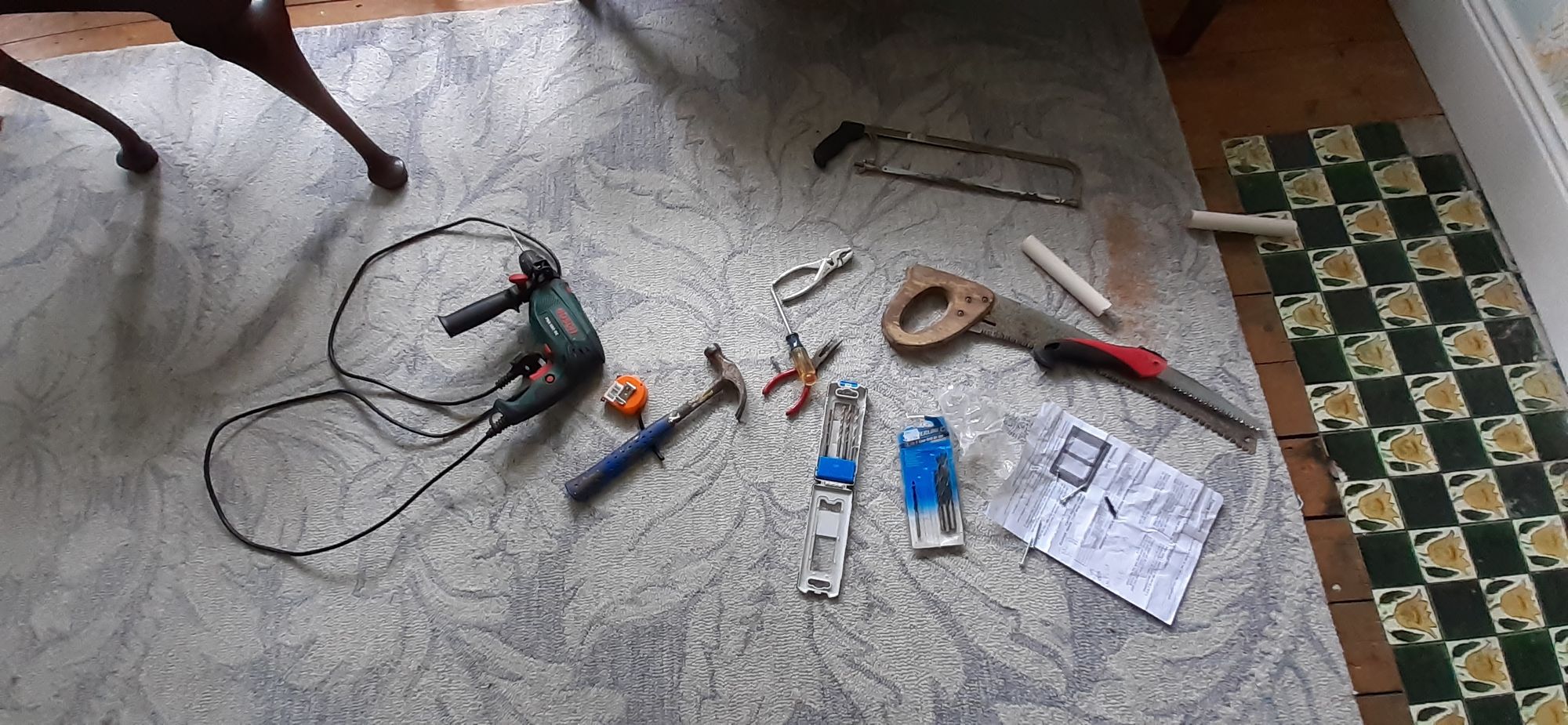 Note the crocheted canopy made by my mom. It doesn't quite fit this bed, but close enough. This spring I finally hung the quilt mom gave me. Another project I was able to put off for more than a year. Below are the tools I needed to get the job done.
