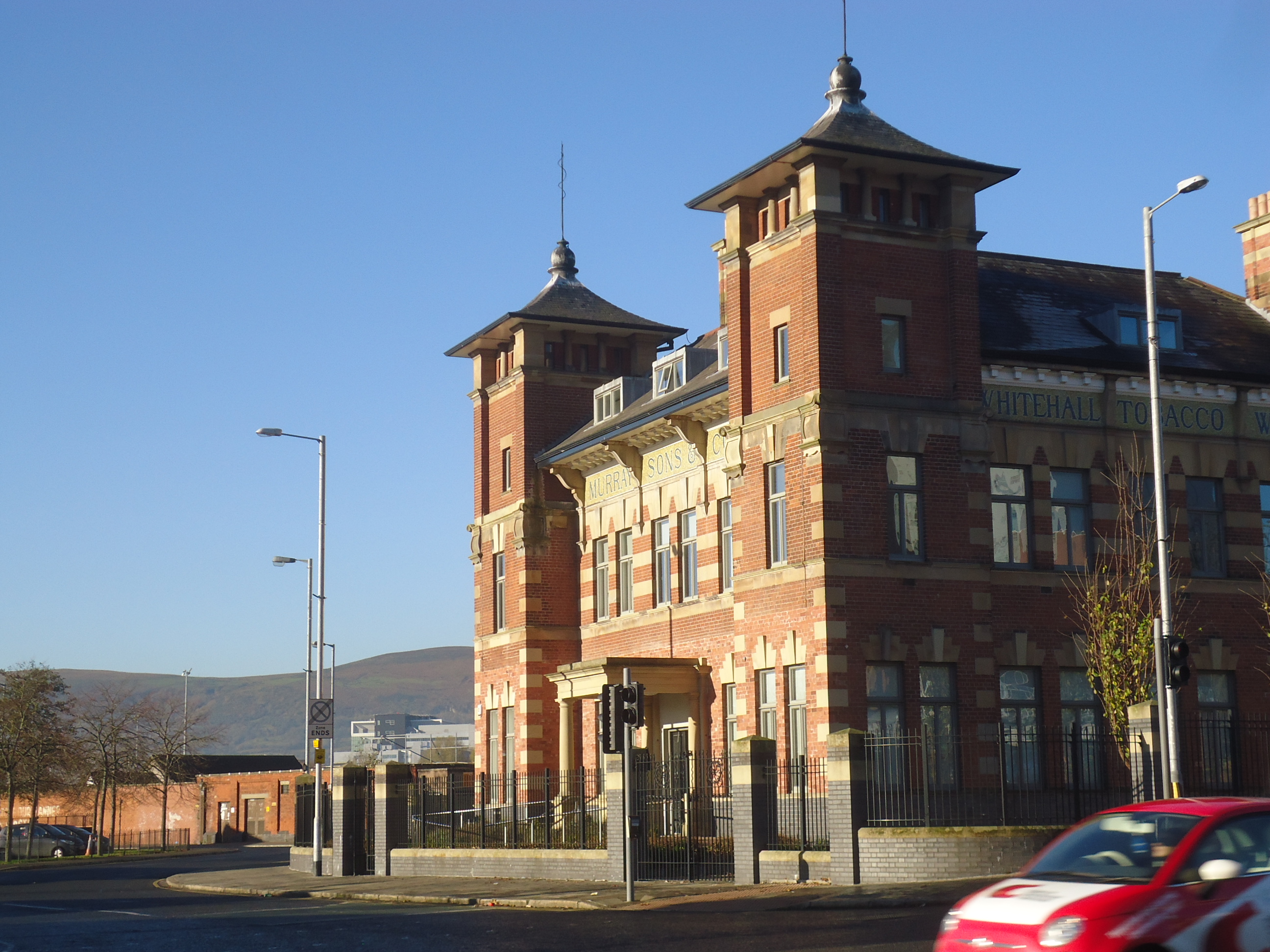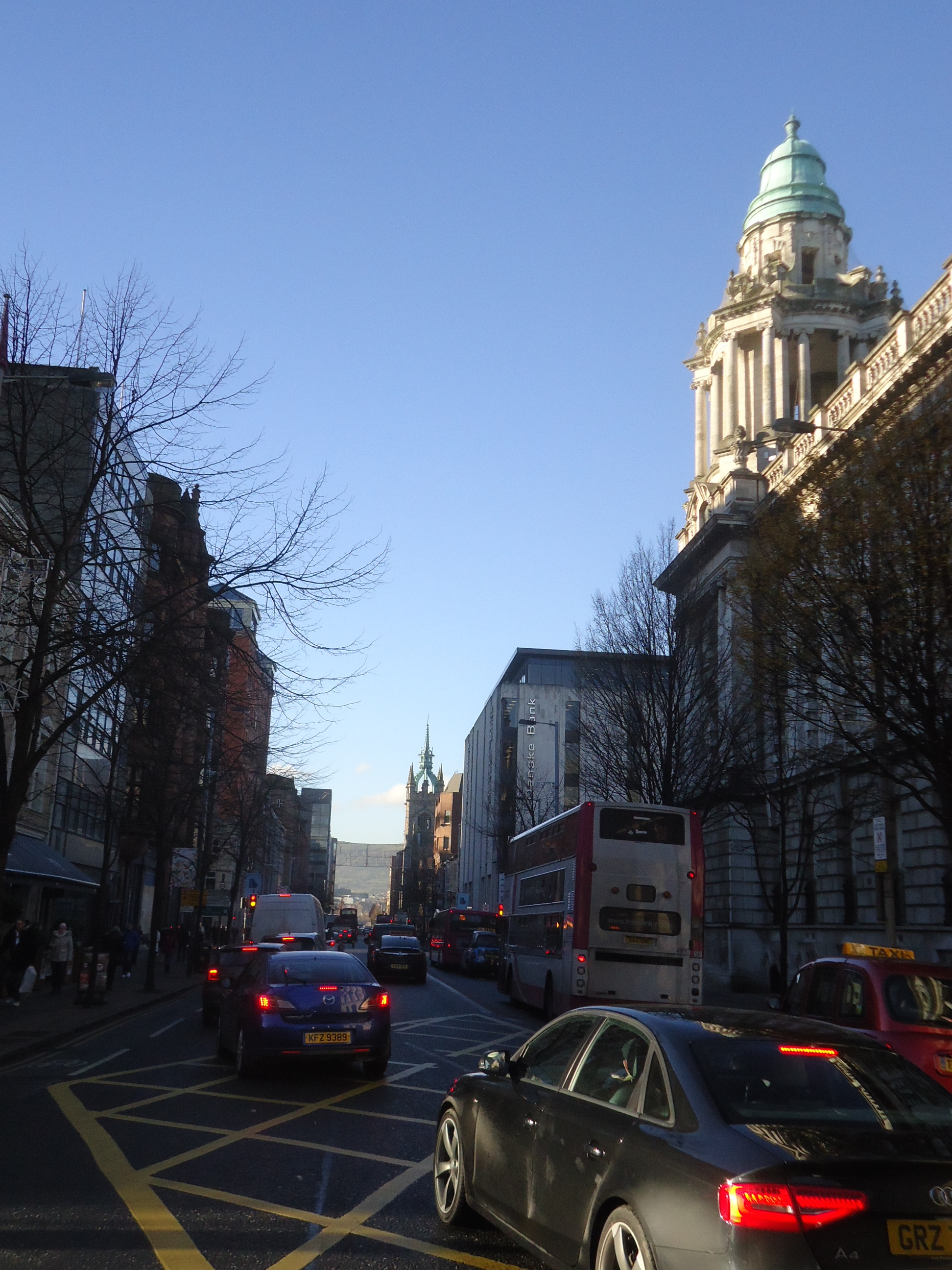 It was once the headquarters of a tobacco company. I love the hills in the distance. Belfast is great for urban vistas against a backdrop of mountainish hills. Or hillish mountains. Here’s a shot from downtown (city hall on the right):