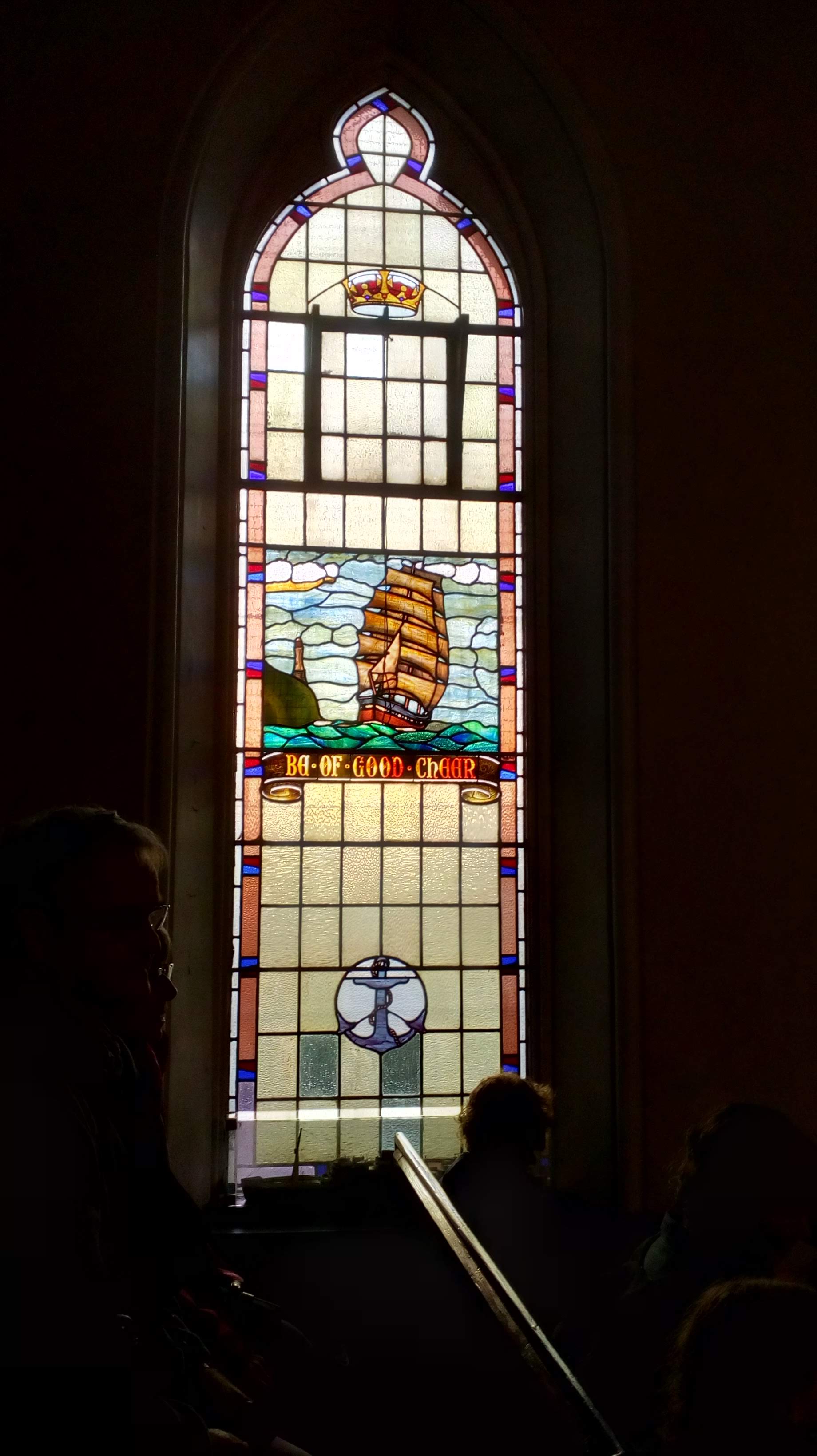 I went home after the march to do a bit of work and walk Paddy, then back into town for Culture Night, an annual evening of music and entertainment all over the city. The first place I went was Seamen's Church--a place full of lighthouses and ship memorabilia. It is in what used to be Sailortown, before the surrounding area was torn down to build an overpass and a lot of car parks. There were a group of musicians performing to honour a songwriter who died in the past year. I didn't know the songwriters' work but I liked the idea of artists gathering to honour one of their own. Kind of like a Seamen's church dedicated to its own tribe. Here's one of many stained glass windows in the church that honour the courage of sailors.