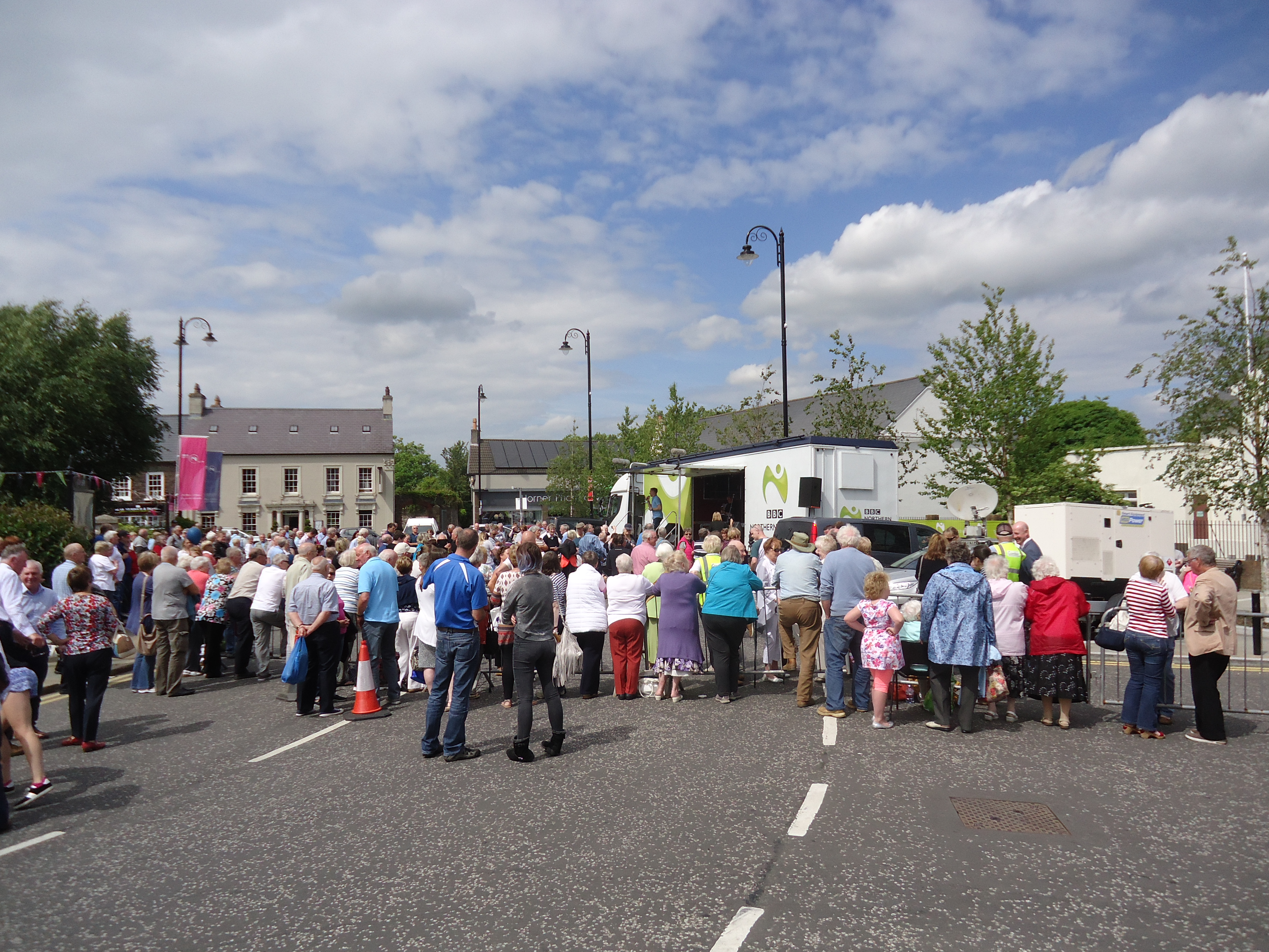 The real attraction for me was Hugo Duncan, who has a show on Radio Ulster that’s a blend of Irish country music and dedications to people in hospital/anniversary/birthday/pass the driving test, etc. BBC Radio Ulster has a big truck that’s a mobile production studio and it was in the Comber town square today with Hugo running the show.