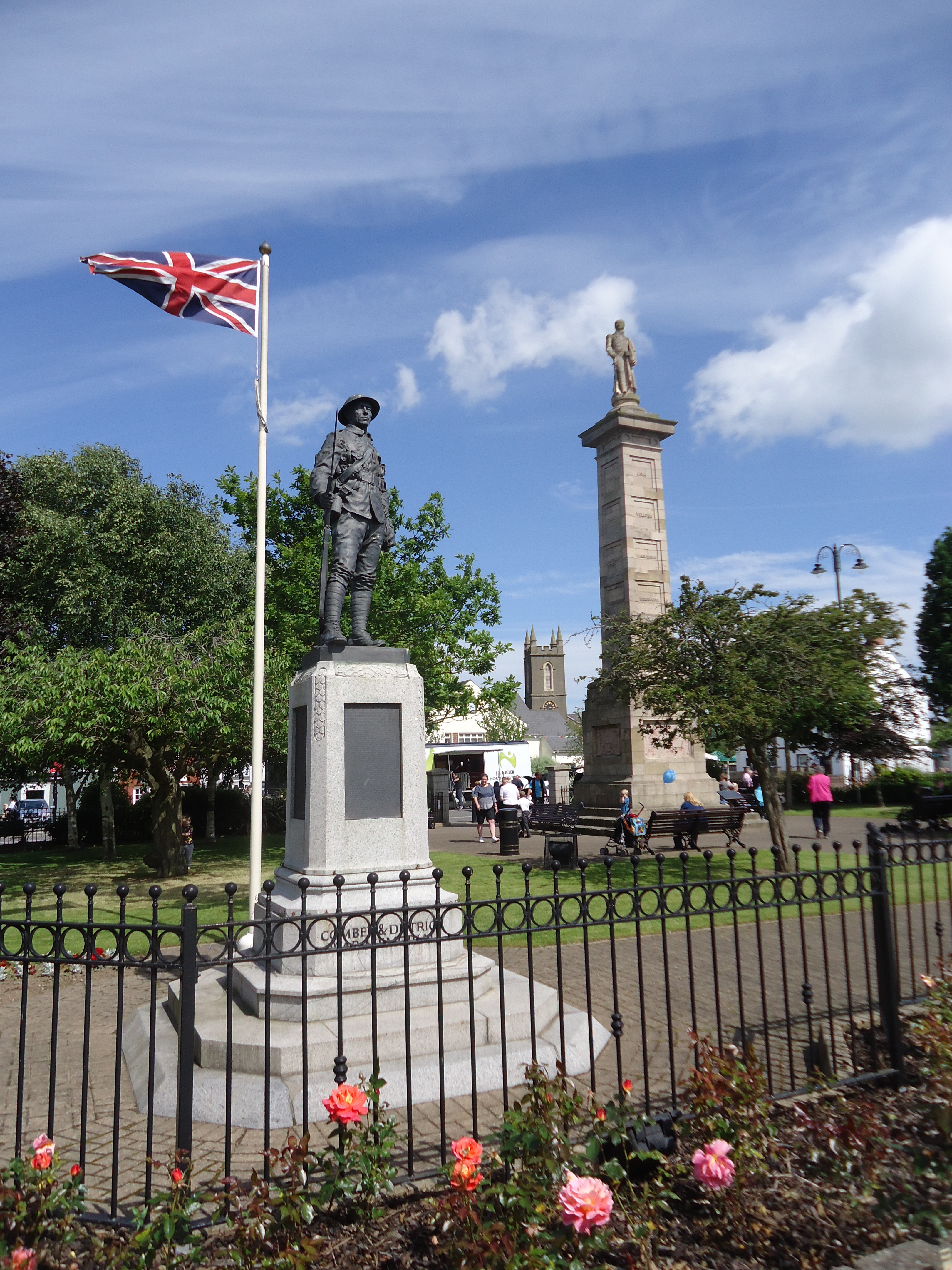 Here are two of the statues in the town square. The foreground is the WWI memorial present in every town--Irish regiments were at the forefront of the battles at the Somme and other bloodbaths. The one in the background is of "Major General Rollo Gillespie. Gillespie was a local war hero from the 19th century, famous for his heroic exploits in India” (wiki).