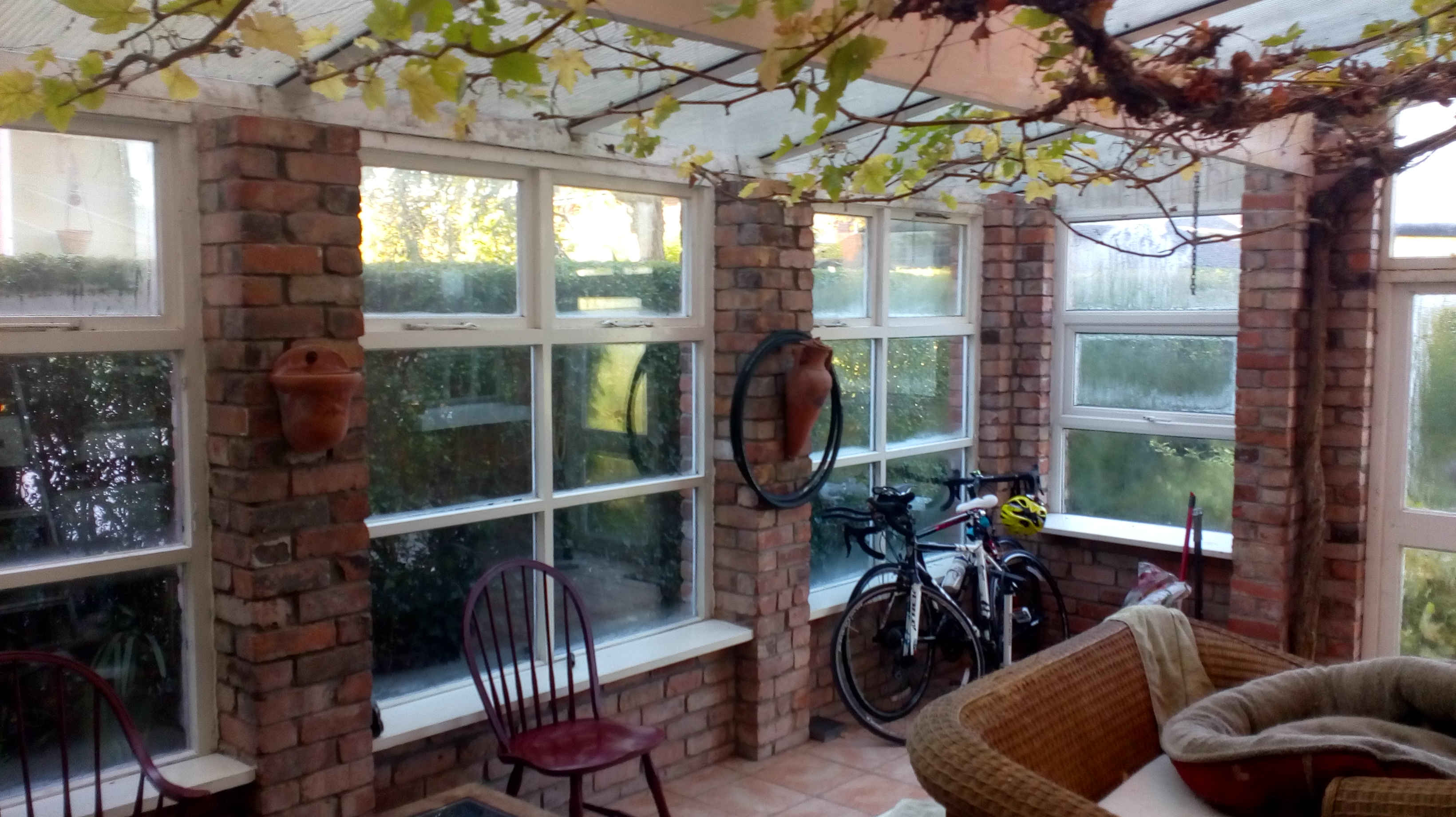 We’d like to upgrade the conservatory to a four-season room (and put a solid wall where the windows now look out on the neighbour’s). I got an estimate last week of 35,000 pounds. So that isn’t going to happen. But we are considering removing the grapevine, which is an interesting conversation piece but creates a year-round mess.