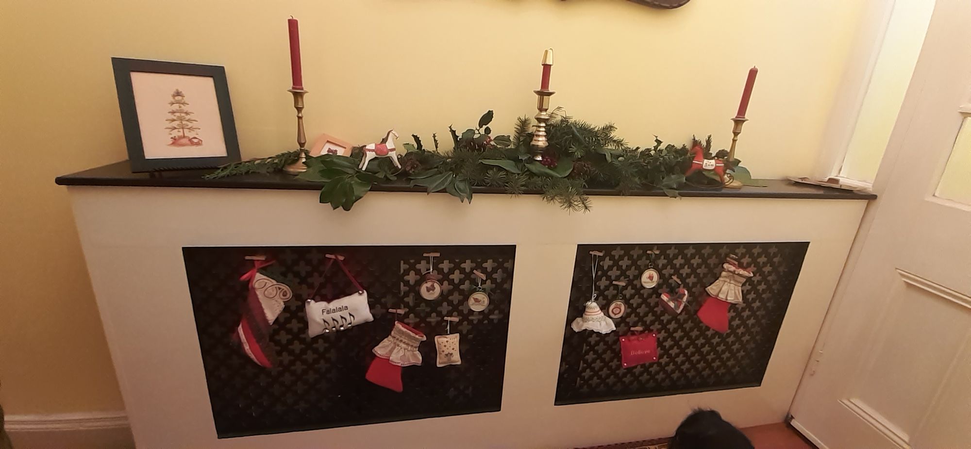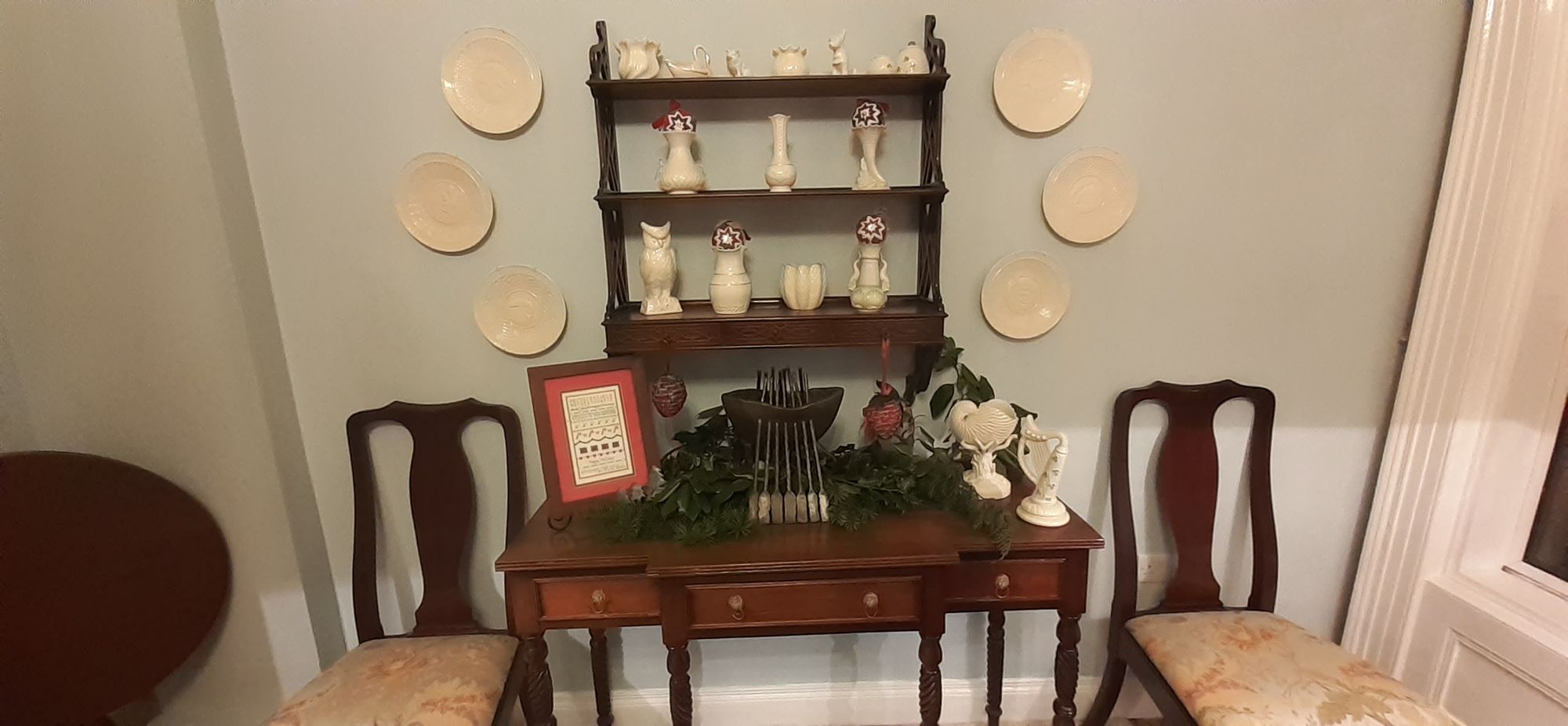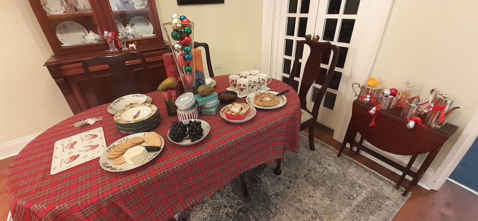 Good thing I have the house decorated--I had two friends over for wine and nibbles on Thursday and I had 16 people over for coffee and treats after our weekly walk at Stormont. Here is the table laid for my two friends; I didn't have time to take a photo when 16 people were descending on me.