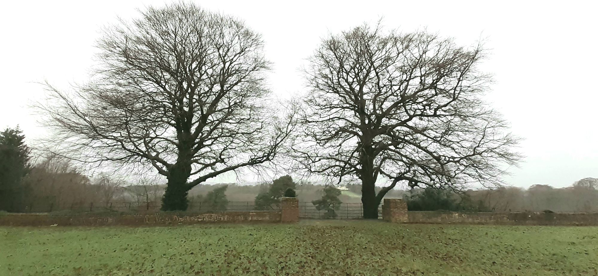 Sunday I walked Paddy at Giant's Ring, played 14 holes of golf, and walked Paddy again. These two trees are on the border of a formal terraced garden; Malone House barely visible in the distance.