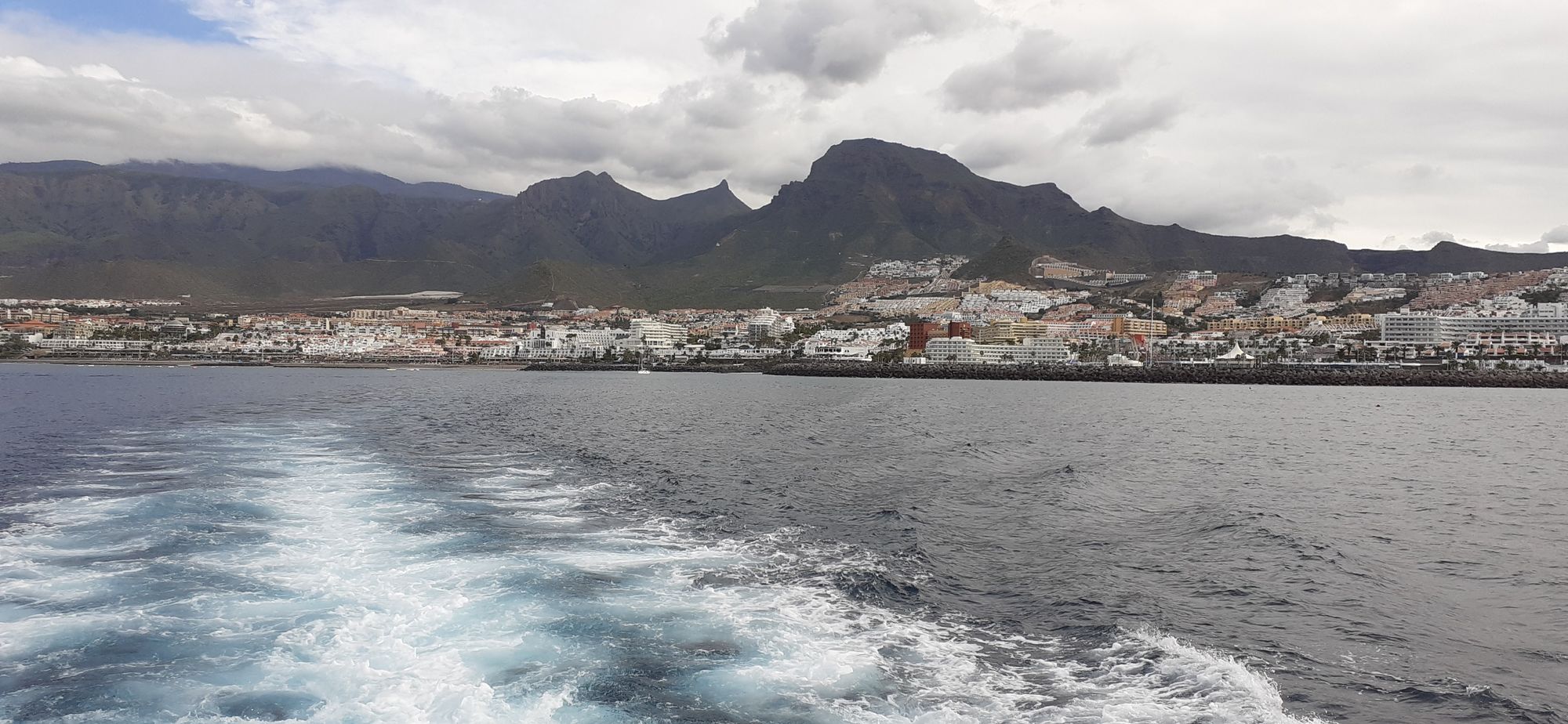 Today (Thursday) we took a dolphin cruise, during which we saw lots of pilot whales, which feed on squid in the strait off the island. Also, a pod of Atlantic spotted dolphins swimming and skipping alongside the boat. This is the view looking back to Puerto Colon.