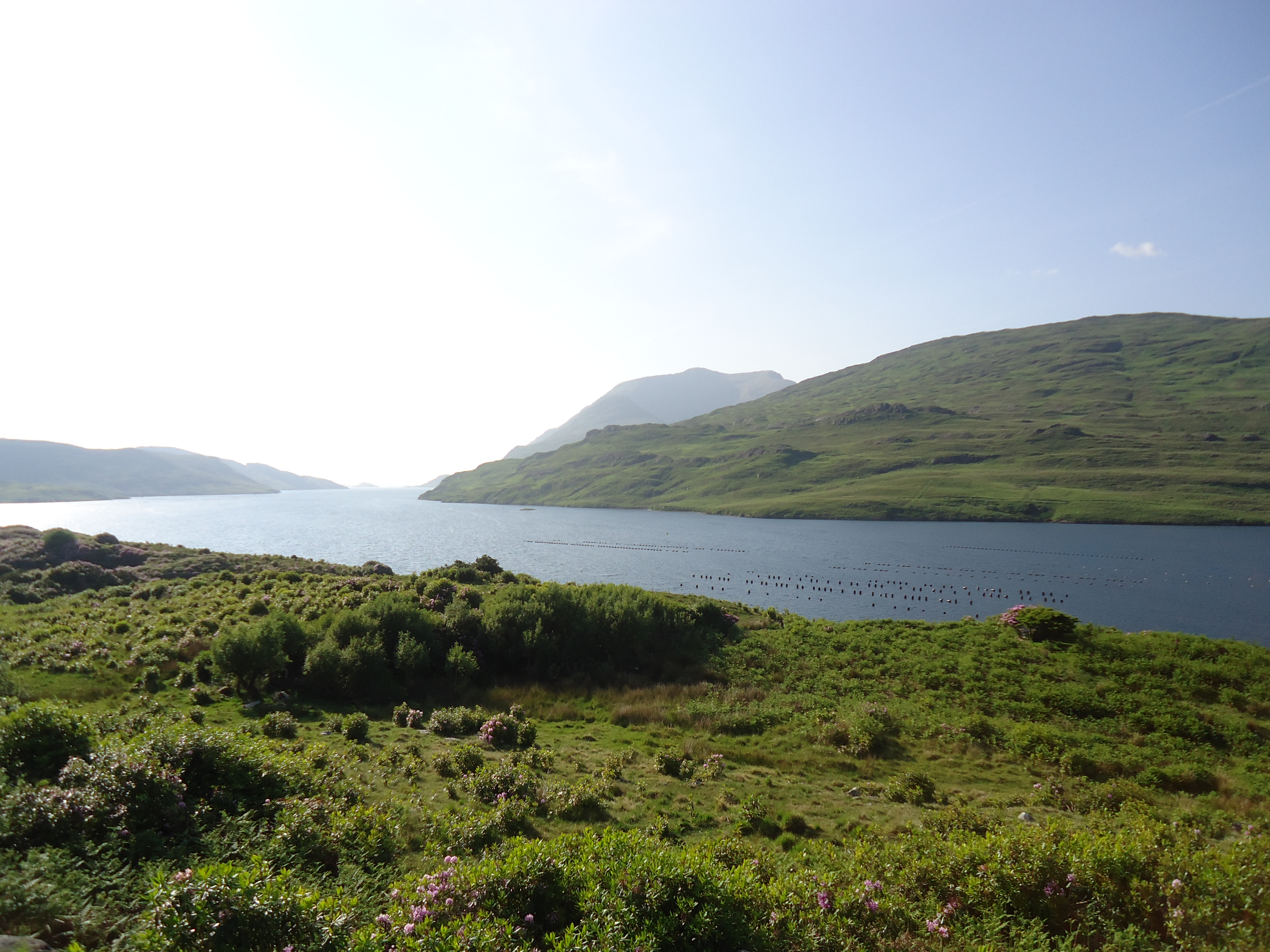 I took this photo of Killary Harbour last night on the way to Leenane but got tired of elevating photos for Day 2. There were a lot of nets for farmed salmon and mussels. Ick.