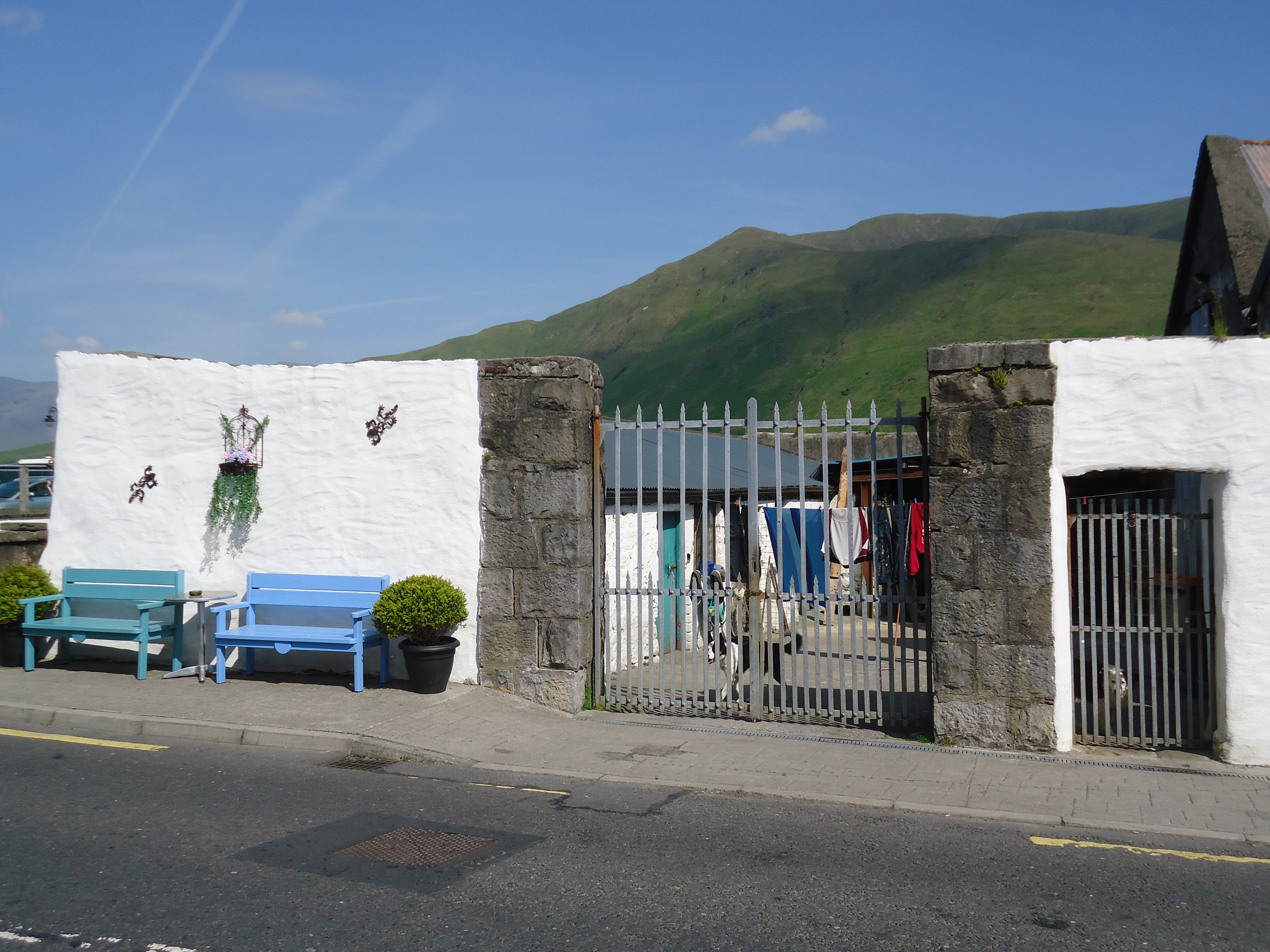 I took this shot in Leenane this morning because I liked the juxtaposition of the tourist kitsch and the courtyard with the laundry and three border collies.