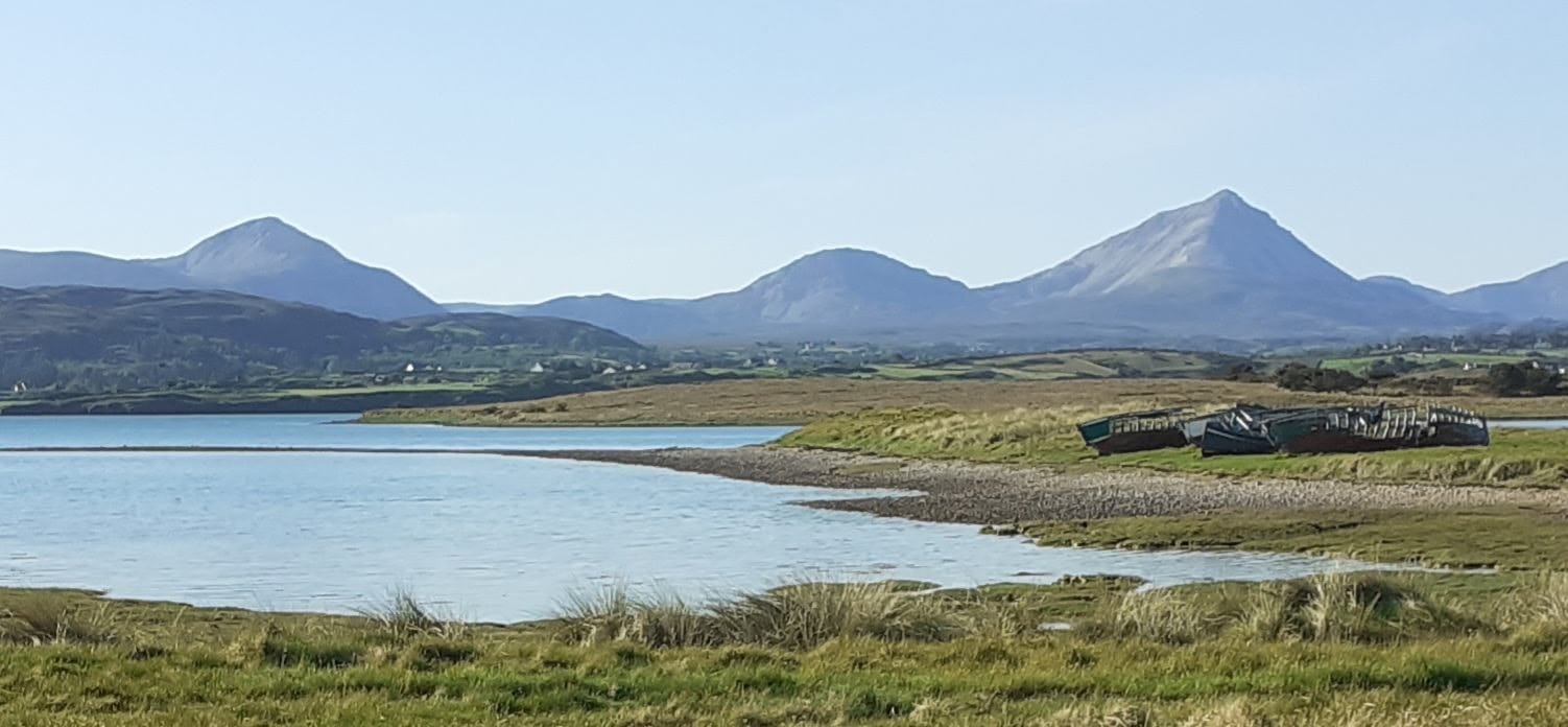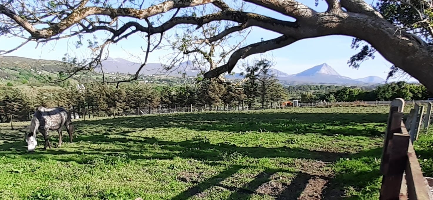 There are two horses in the field in front of the cottage – the old gray mare shown with Mount Errigal in the background.
