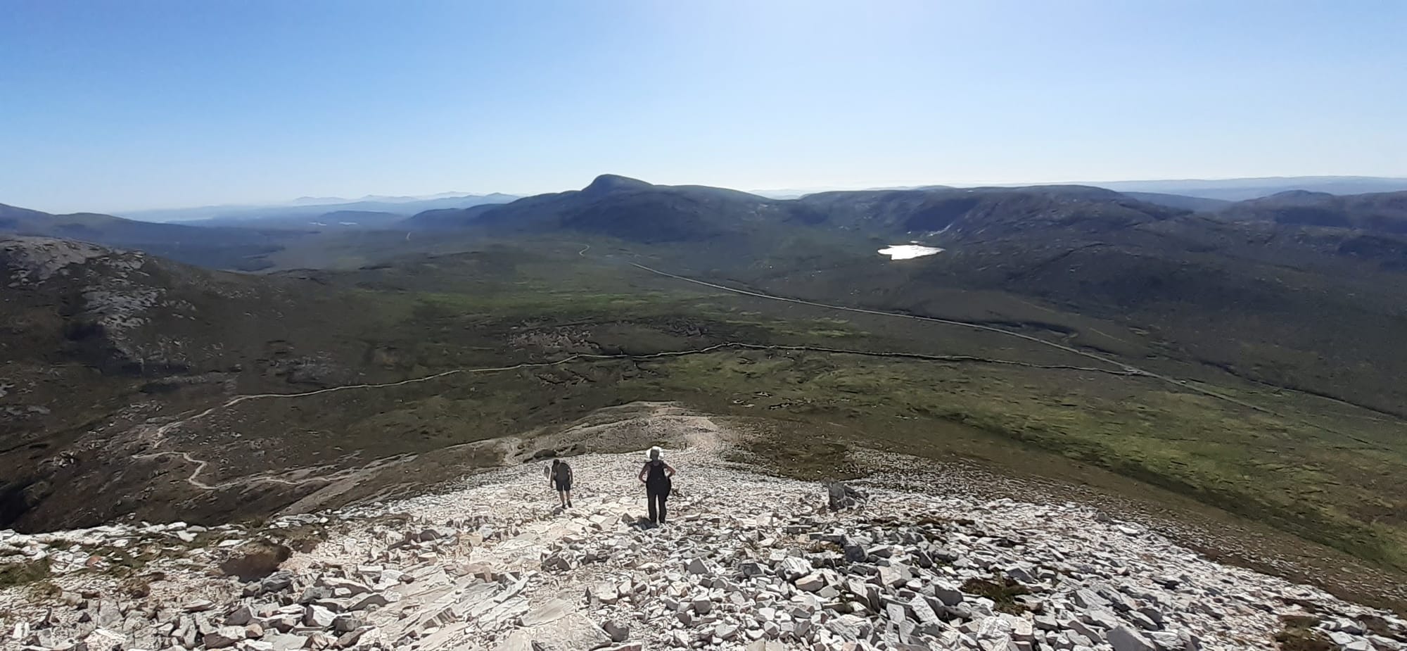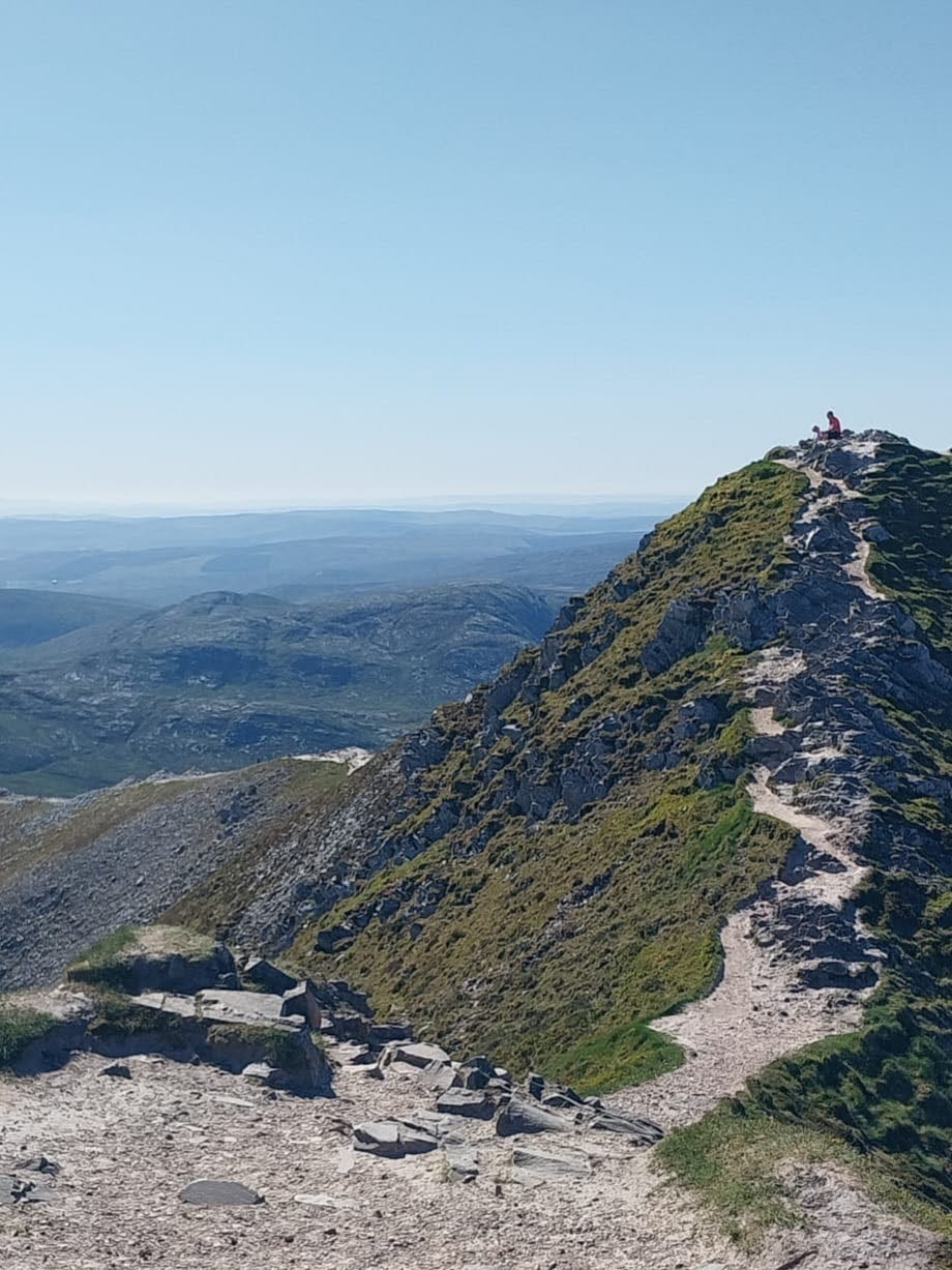 Friday morning I returned to Magheragroarty beach with the dogs for a run. Daphne has mostly been good, sticking with Paddy, but today she went on a tear through the dunes (chasing rabbits) and it took me a while to get her back. Then I took Dara to climb Mount Errigal. Below is Dara surveying the trek on the way up.