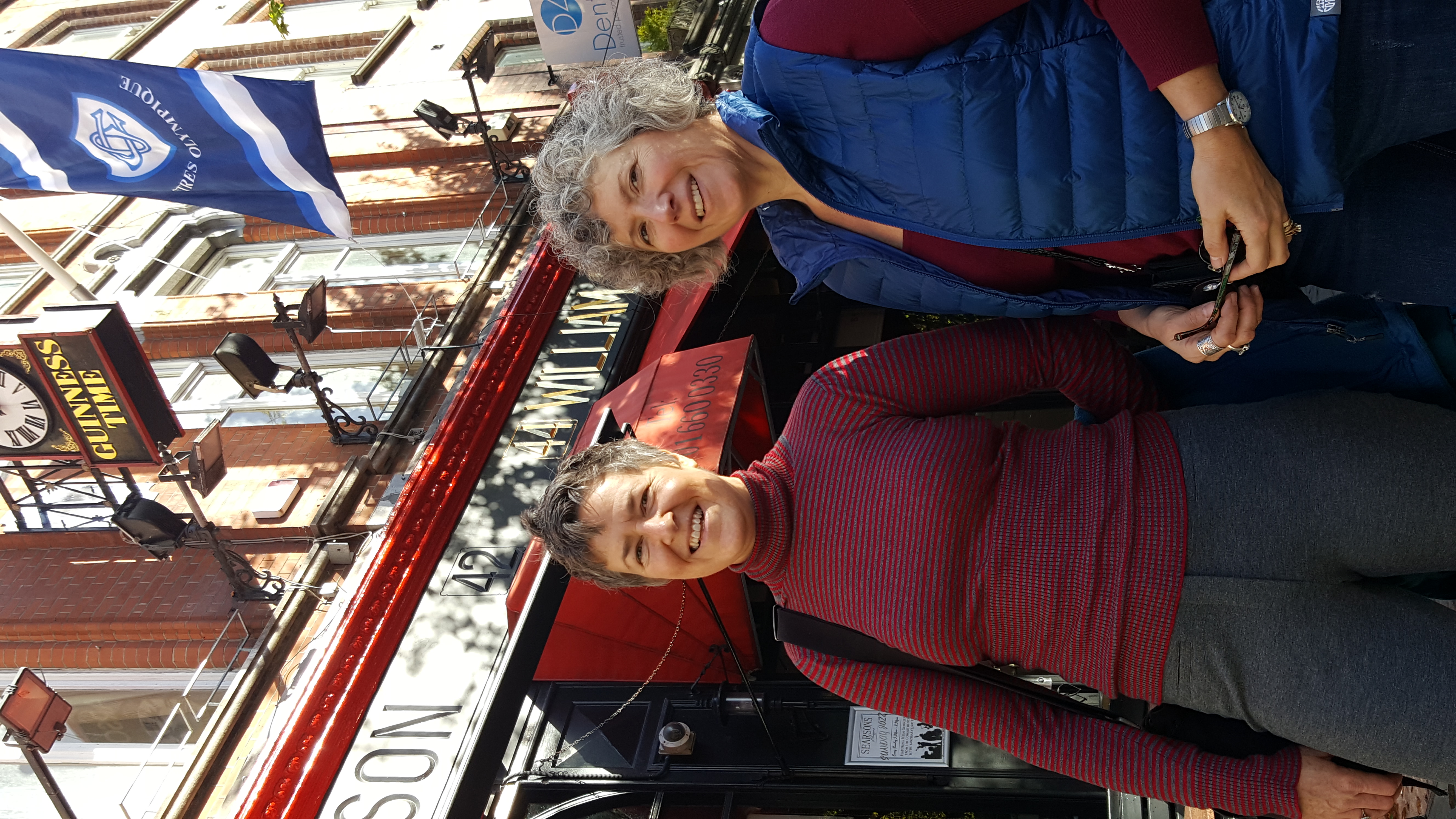 I took the bus down and had lunch at a pub called Searsons with Theresa, my former yoga instructor at Vanguard, and her husband, Don, who writes a syndicated column about beer. He’s leading a tour of 24 people around Ireland. They have an amazing itinerary planned (Dingle peninsula, Cliffs of Moher, Aran Isles, Galway) and quite a few pubs and breweries, so they are in for a fantastic time. Here we are in front of the pub: