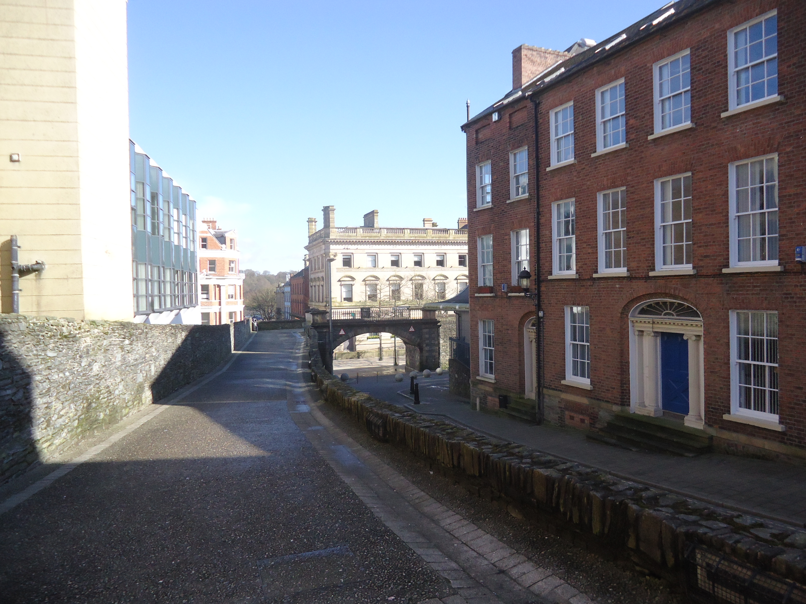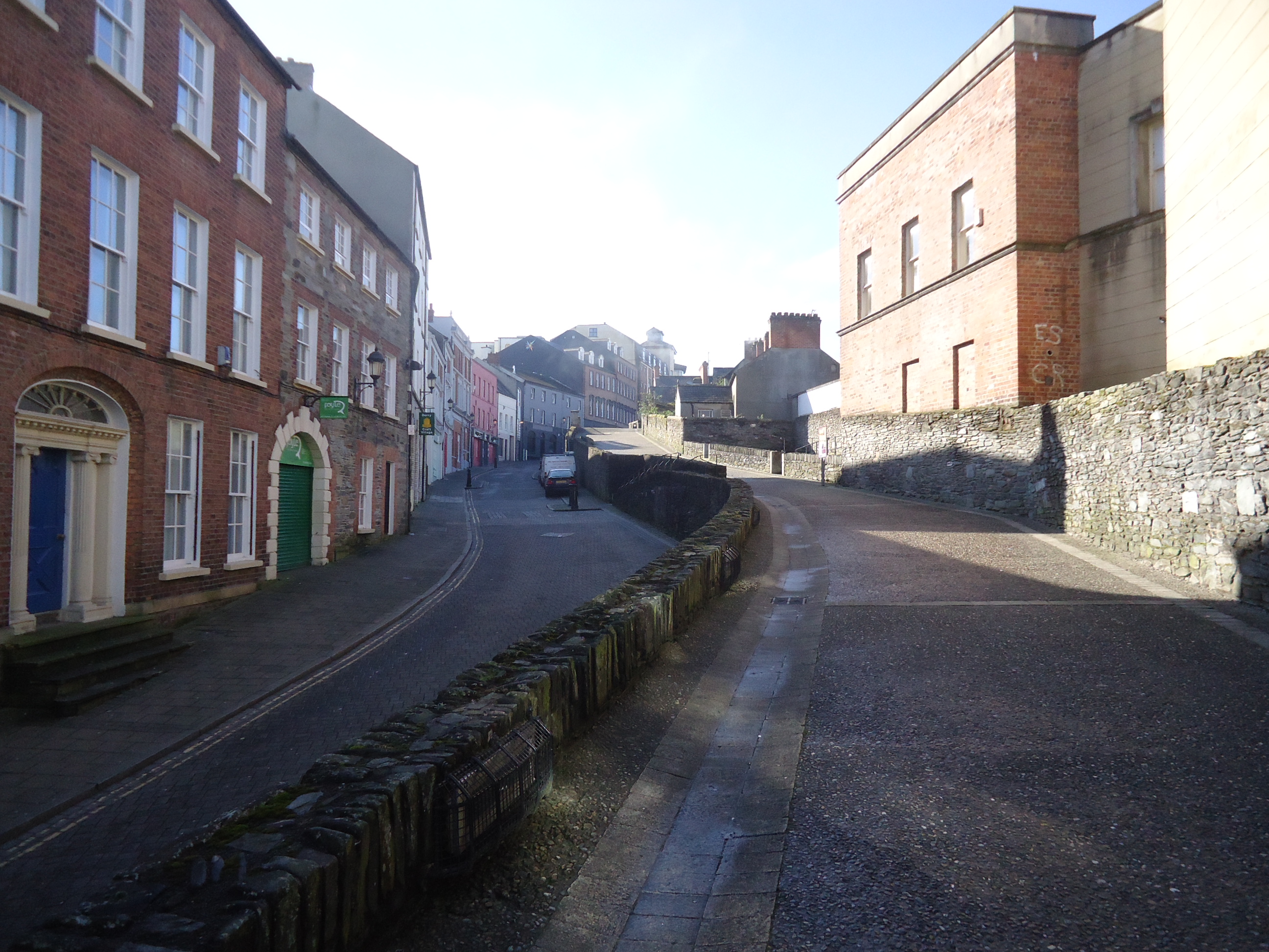 I walked around the city for a while. I walked on top of the city walls. This photo looks downhill toward the River Foyle.