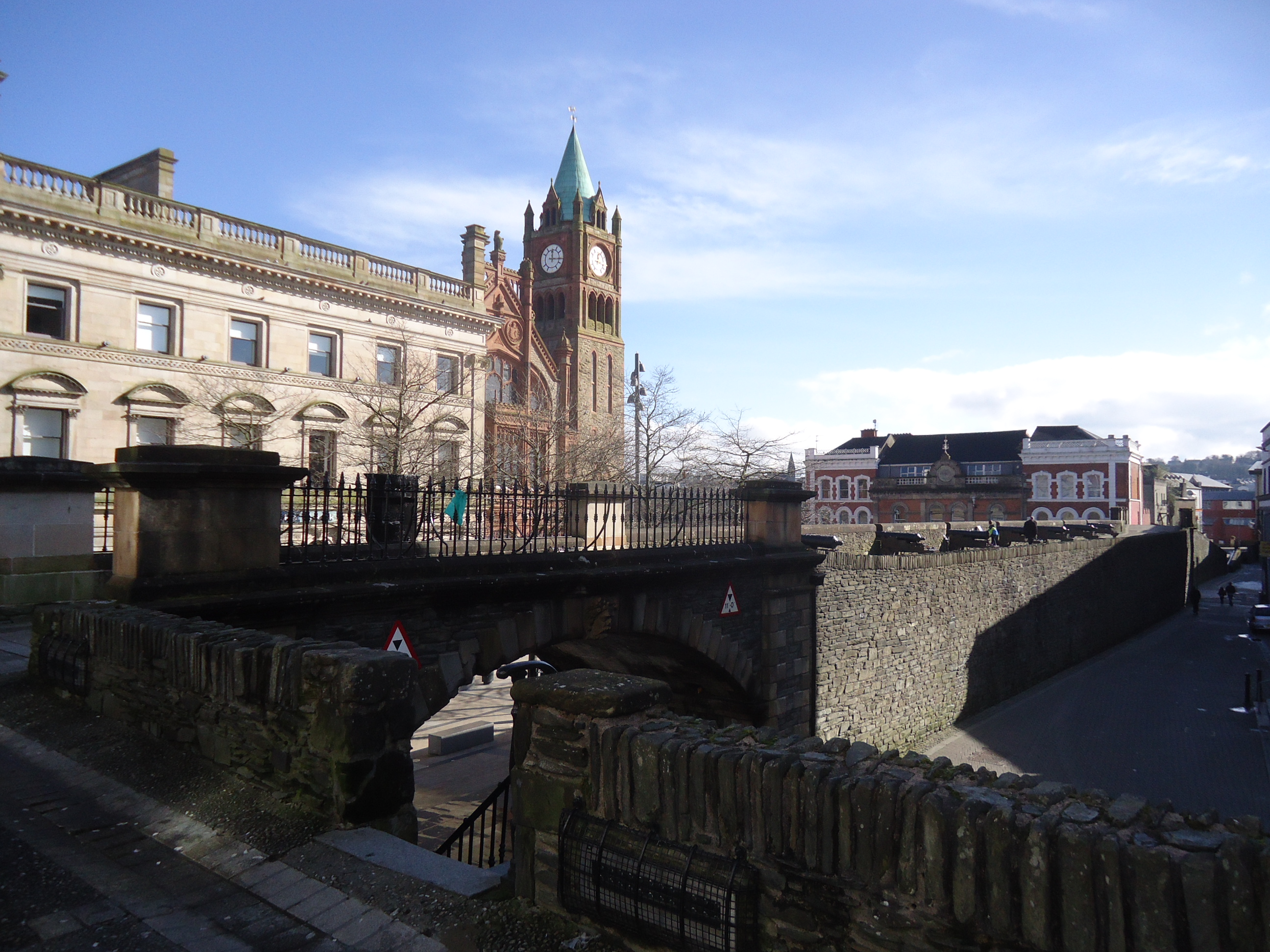 This photo is a corner in the city walls with the Guildhall in the background. I don’t know if you can see the row of canons facing the Guildhall. When the walls were built in the 1600s, the Foyle came right up to the walls. The canons would have aimed at French or Spanish ships coming in aid of native Irish Catholics who were being dispossessed of their country by settlers from England and Scotland.