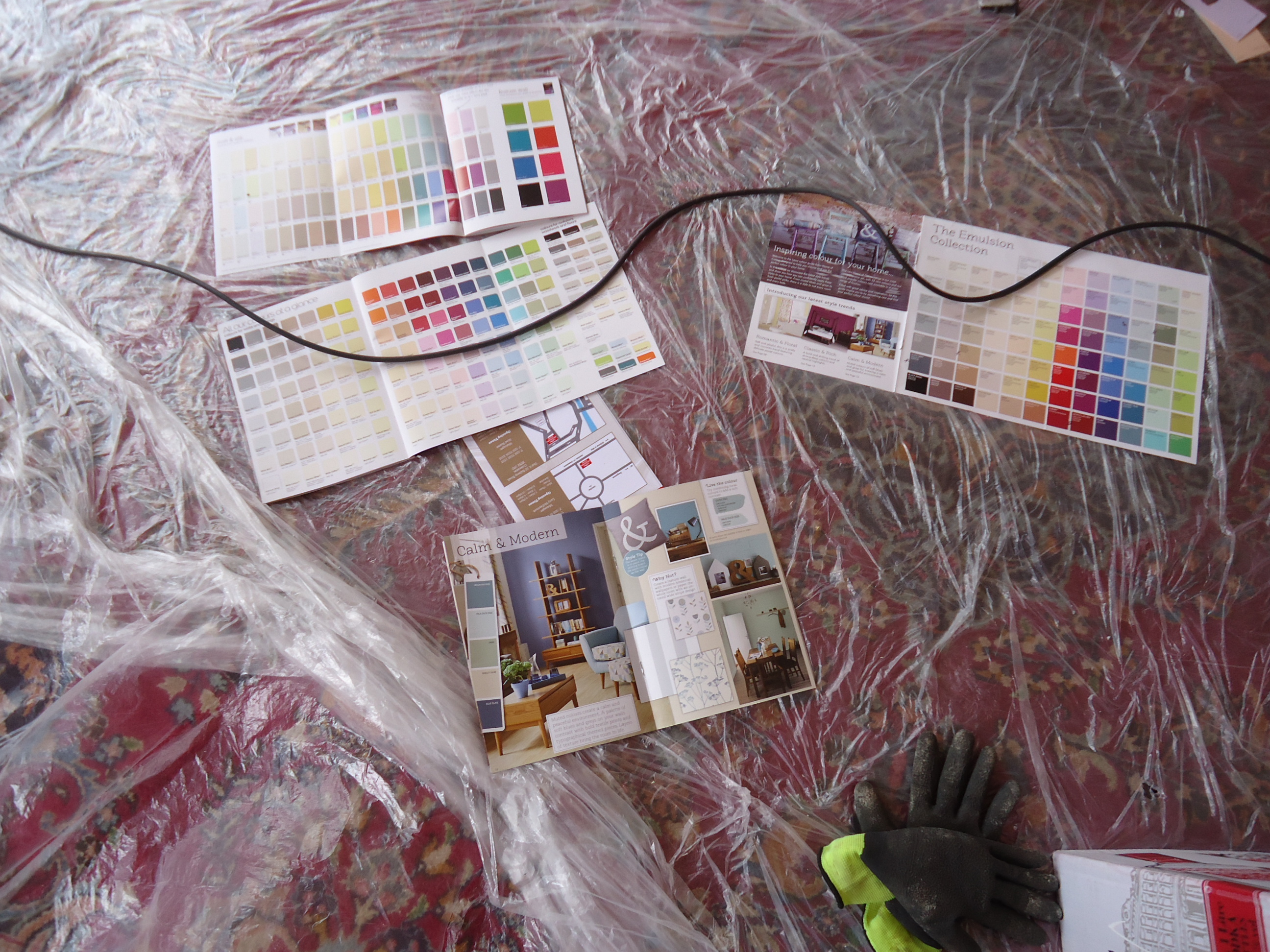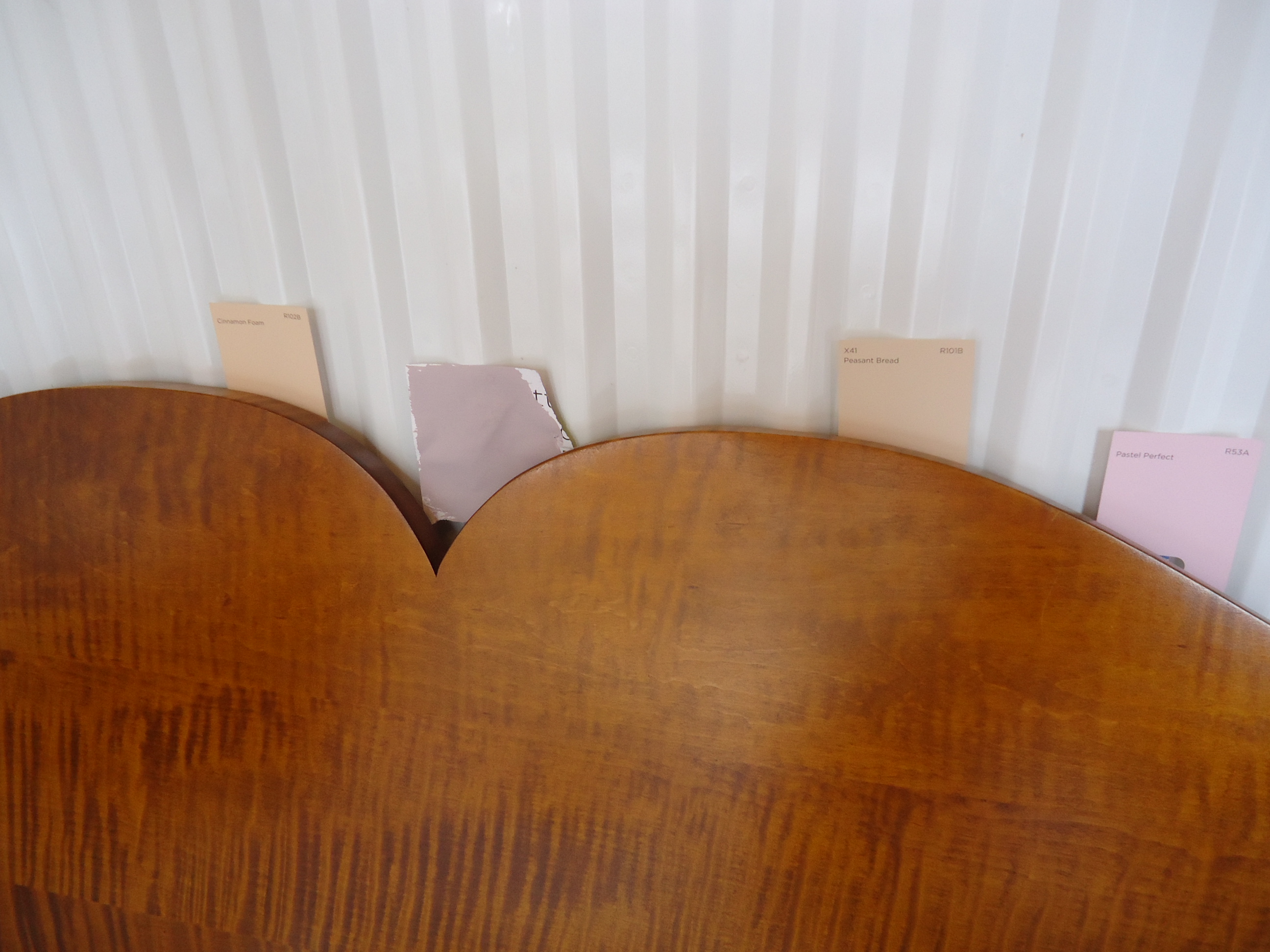 I live in a linear world that imposes order on everything I do. To select a color for the master bedroom, I first must decide what rug will go in that room (the pastel or the raspberry?). Once that's decided, I then must figure out what color will work well with that rug, and also complement the tiger maple furniture? This is the headboard leaning against a radiator with a narrowed down selection.
