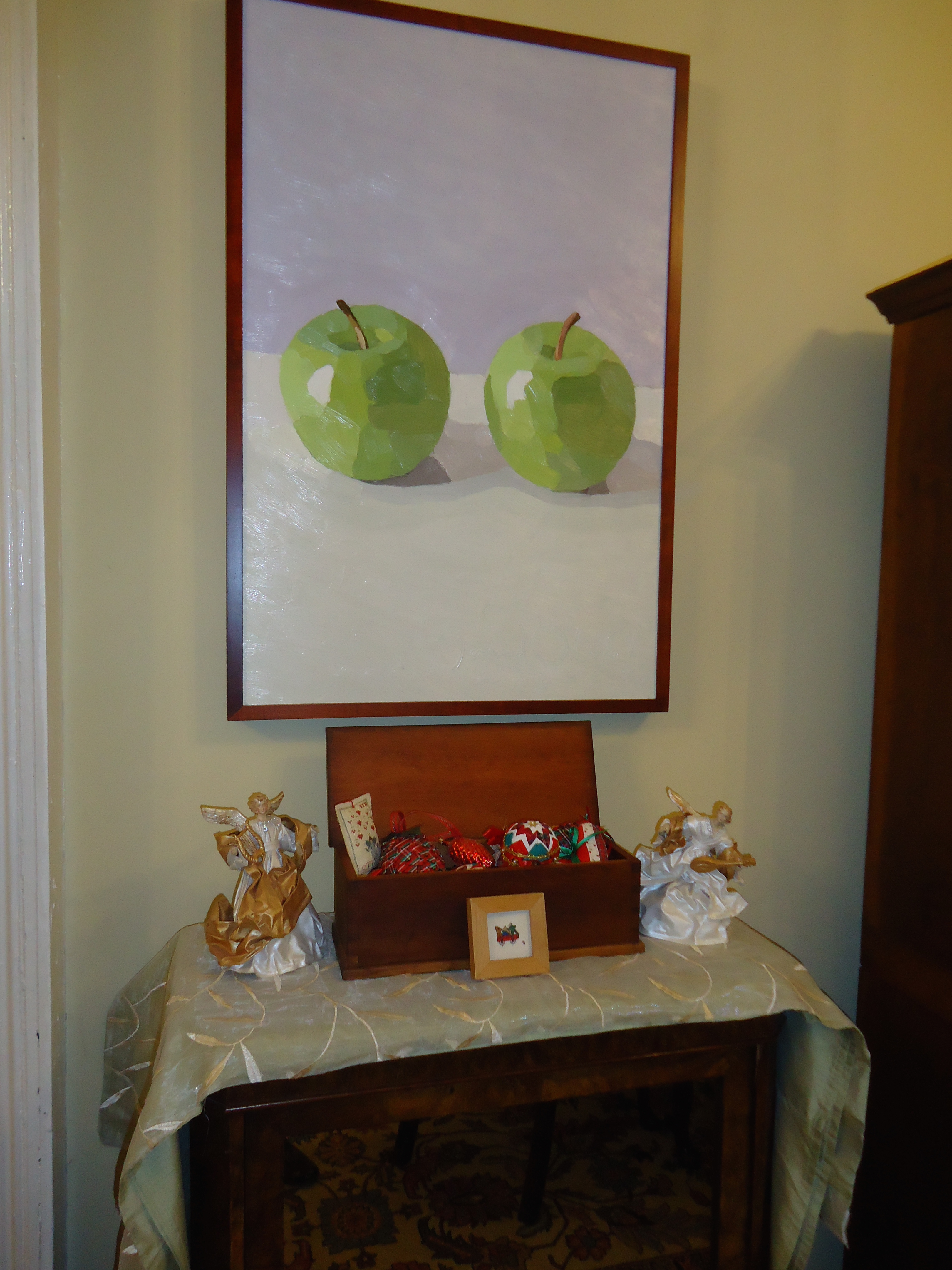 The piece of furniture below used to be in the foyer covering the electrical panel with all the breakers. The new radiator cover (yesterday’s photo) hides both that panel and a radiator we added in the foyer. Now this cabinet is sporting a candle box made by my dad which holds an array of Christmas ornaments made by my mom. I’m not sure how I grew up around creative people without a speck of talent.