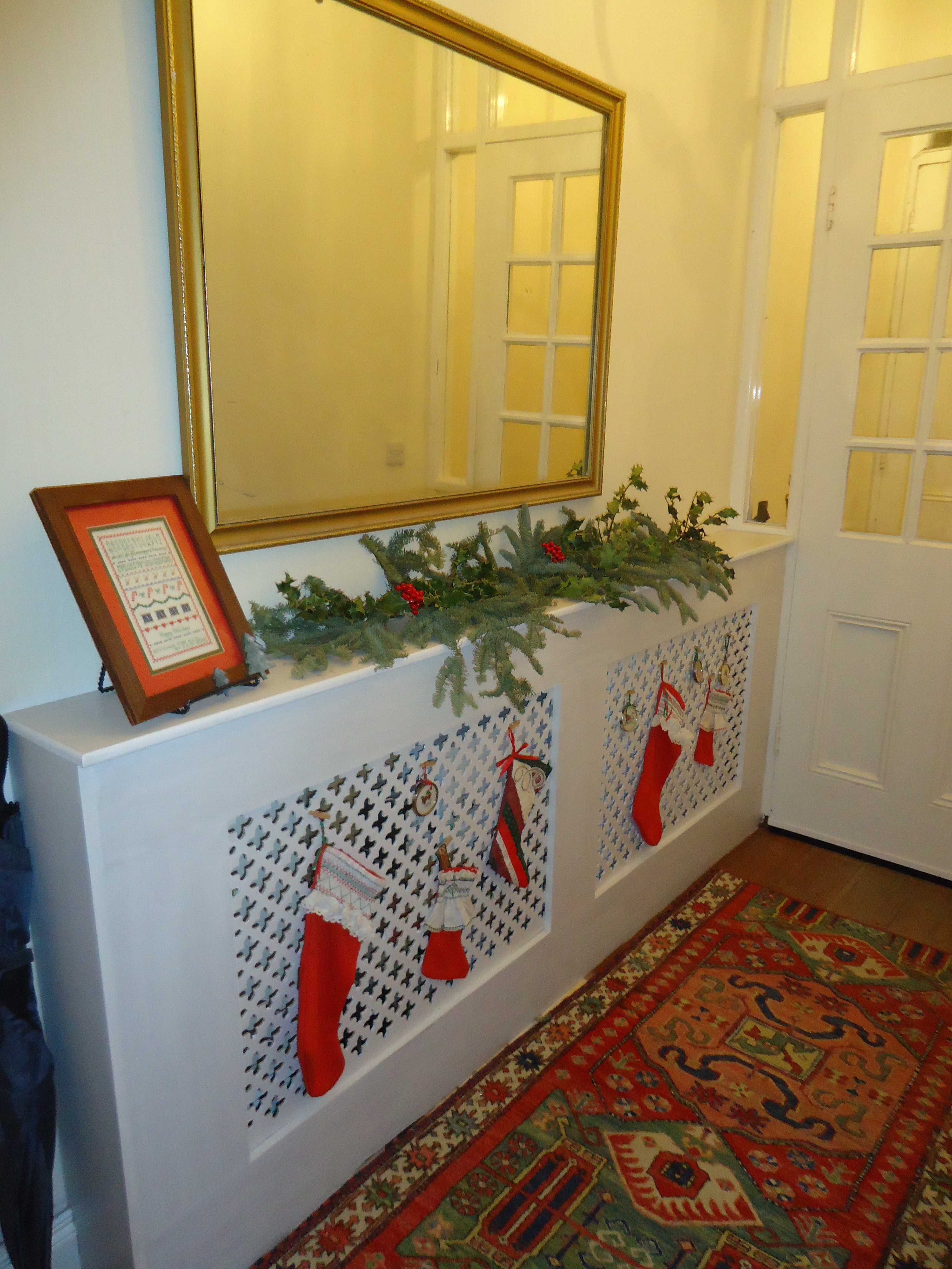 The Christmas photo isn’t really an “after” photo because the foyer needs to be painted yellow, we need a new mirror, and the radiator cover is only primed at this point. But I wanted to show off the collection of smocked stockings my mom made.
