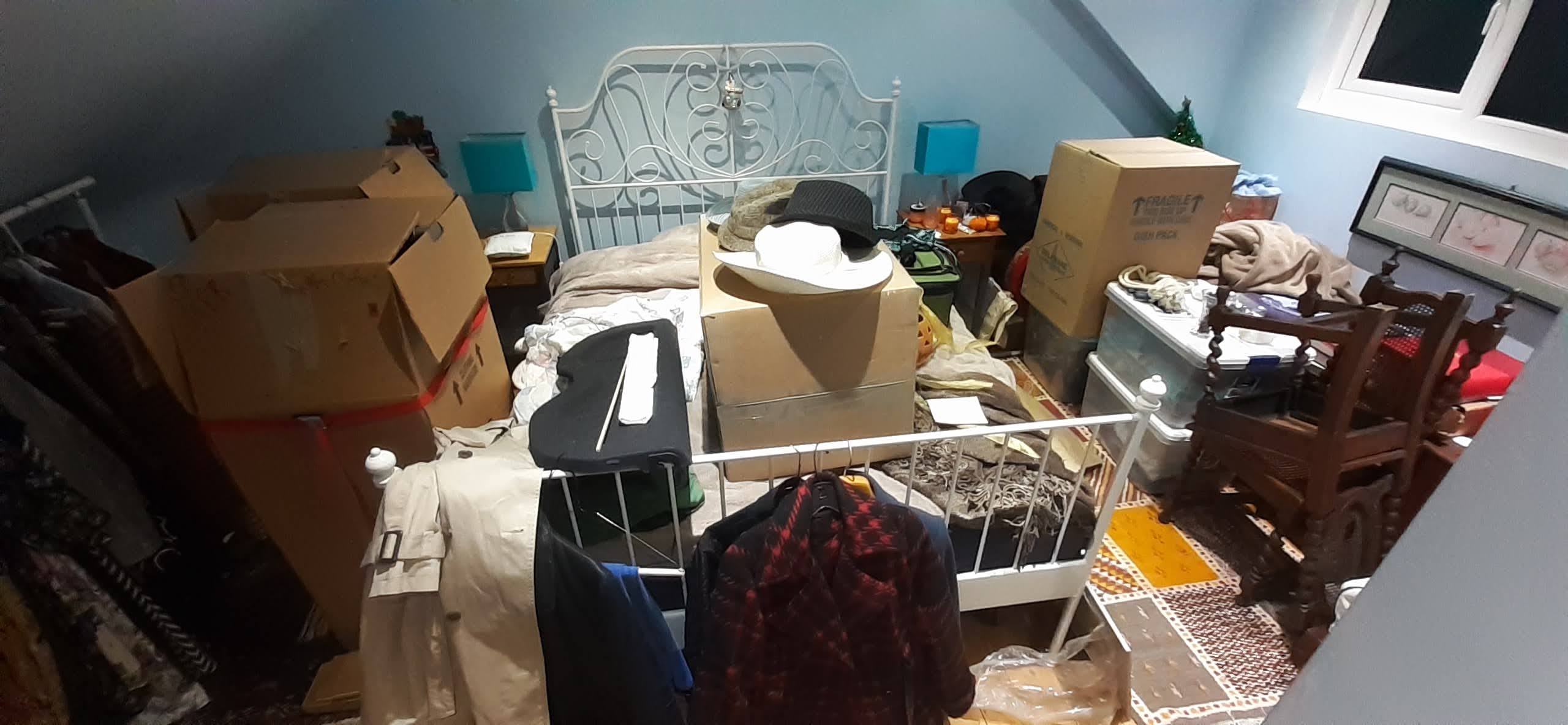 Tomorrow two men will come to install a layer of insulation in the attic over the return (an 8 foot X 20 foot rectangle at the back of, and at a right angle to, the house). They are charging an absolute fortune, but I'm paying the premium to try to make the house more energy efficient before mom arrives. This has necessitated clearing out the attic space. Here is what the guest bedroom looks like right now as a result:
