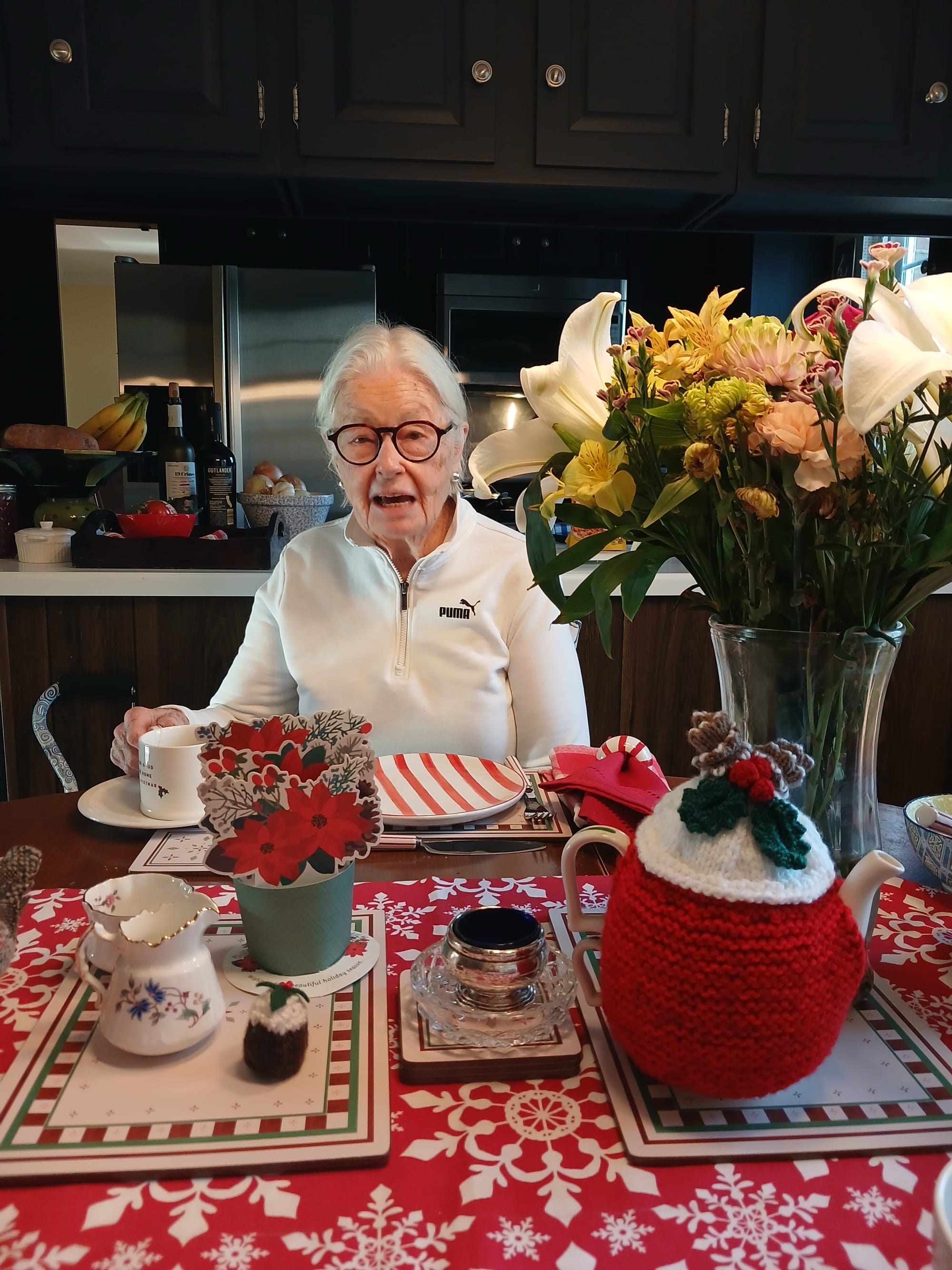 Below is mom with some of her Christmas gifts. Eddis sent the tea cozy last year and the 3D card this year with the cream and sugar. I contributed table mats and cutlery from M&S last year. Cut out of the frame is an 8-inch high robin made from tweeds upcycled from Hanna's Hats in Donegal Town, one of mom's haunts back in the day.