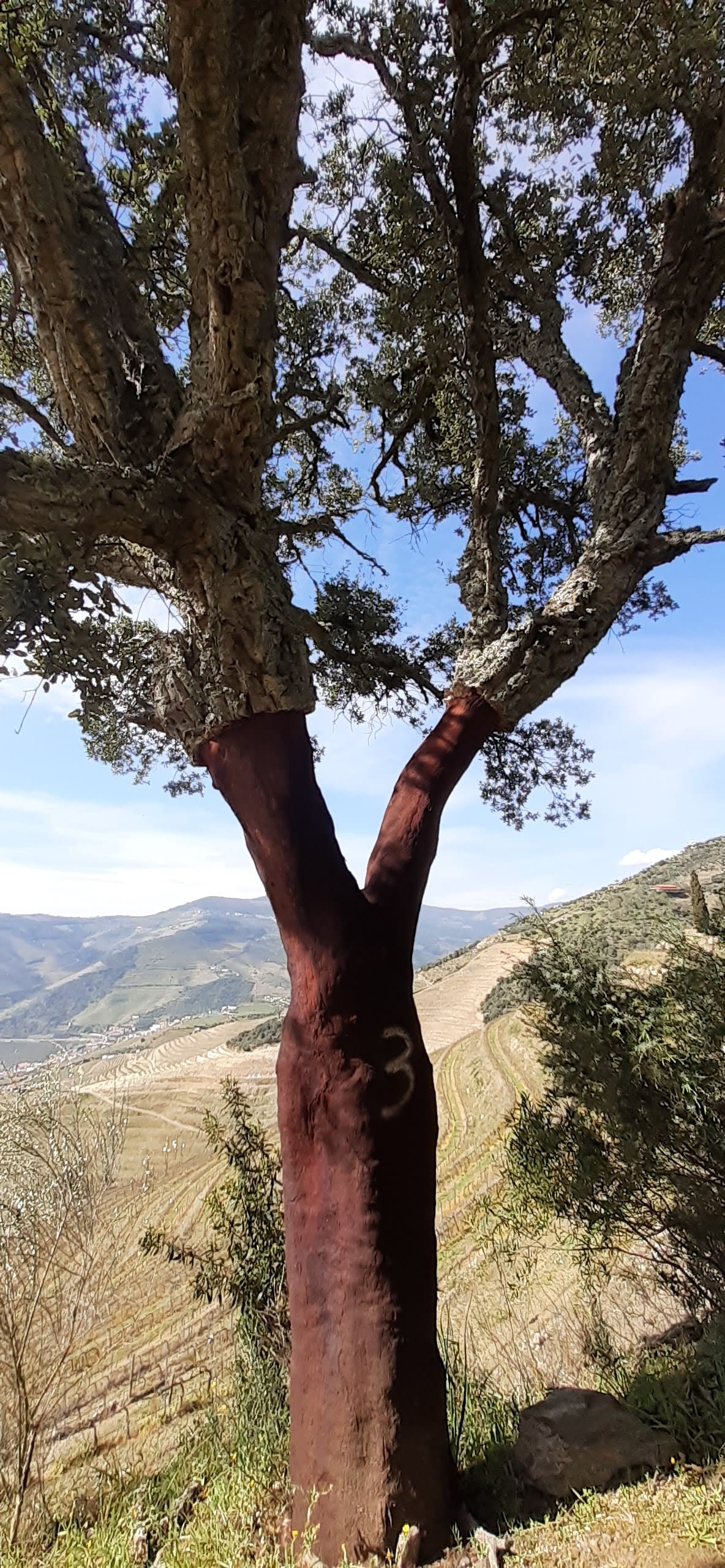 Behold a cork tree, stripped of its bark, which will grow back.